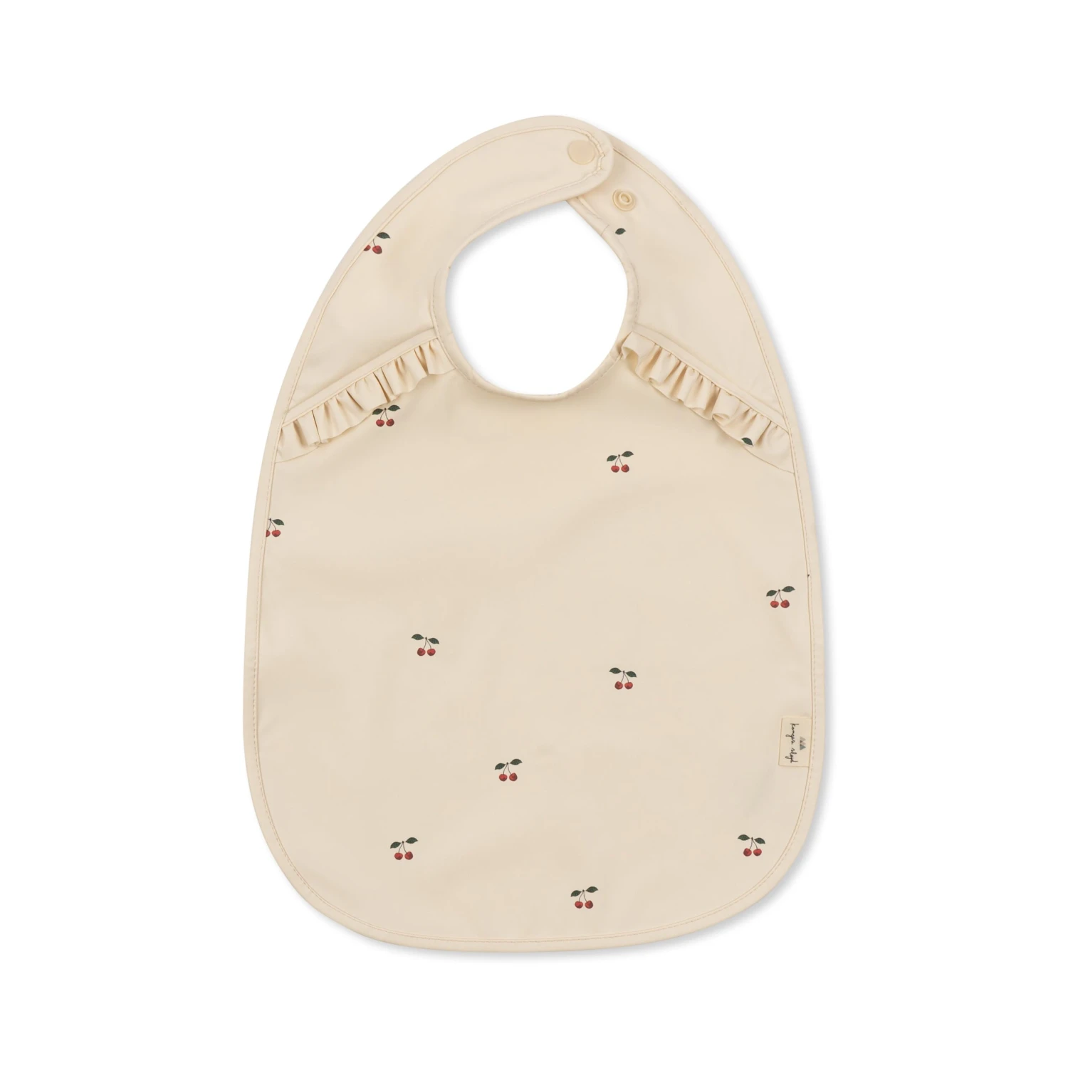 Long sleeved bib designed with elasticated sleeves and snap buttons at the back neckline. Features frills around the shoulders and 100 percent polyester lining.