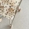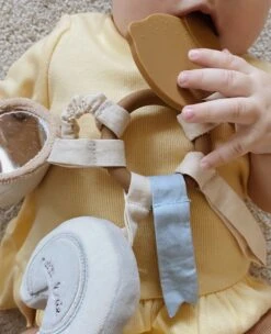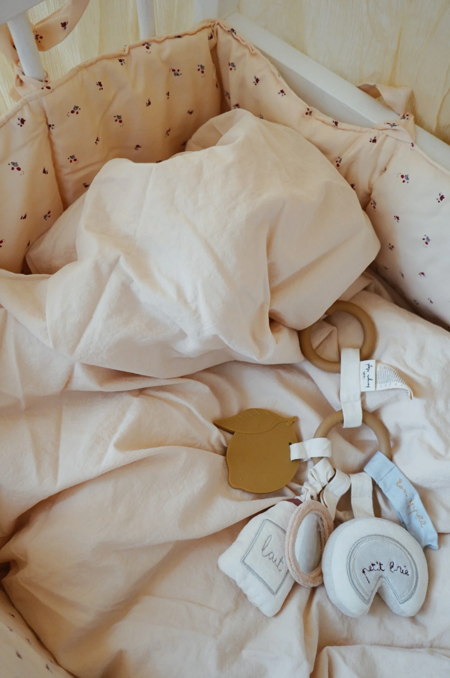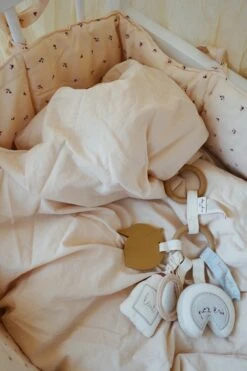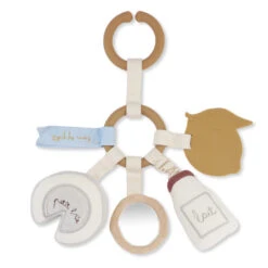 There is a silicone ring with a bunch of things attached to: a little squishy chewing moon, tags to play with, a soft mirror with an embroidery patterned surface on the back, a tiny star with a bell inside that rings when shaken and a rainbow with a crisp inside when touched – all to stimulate your baby’s senses
