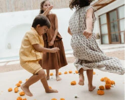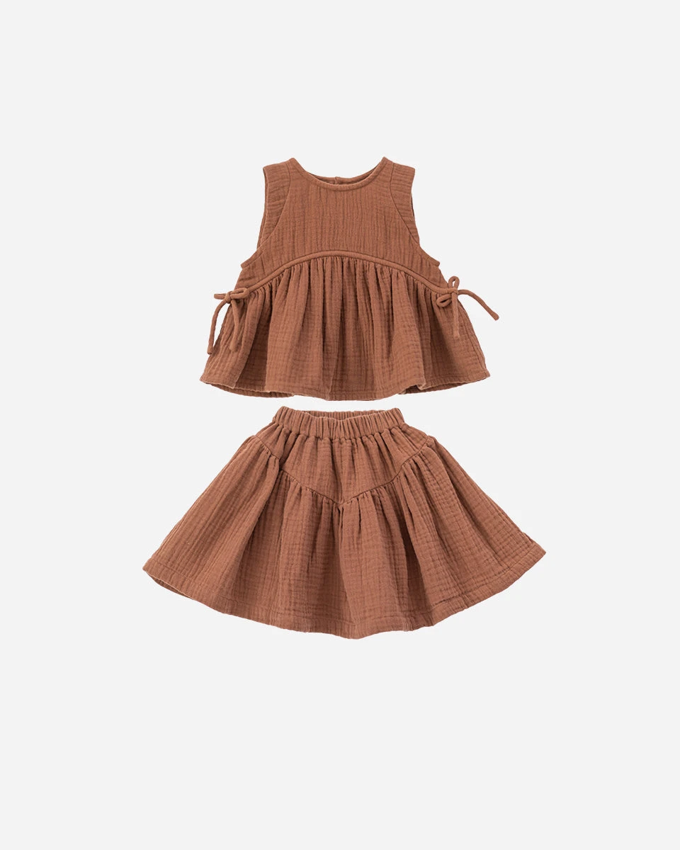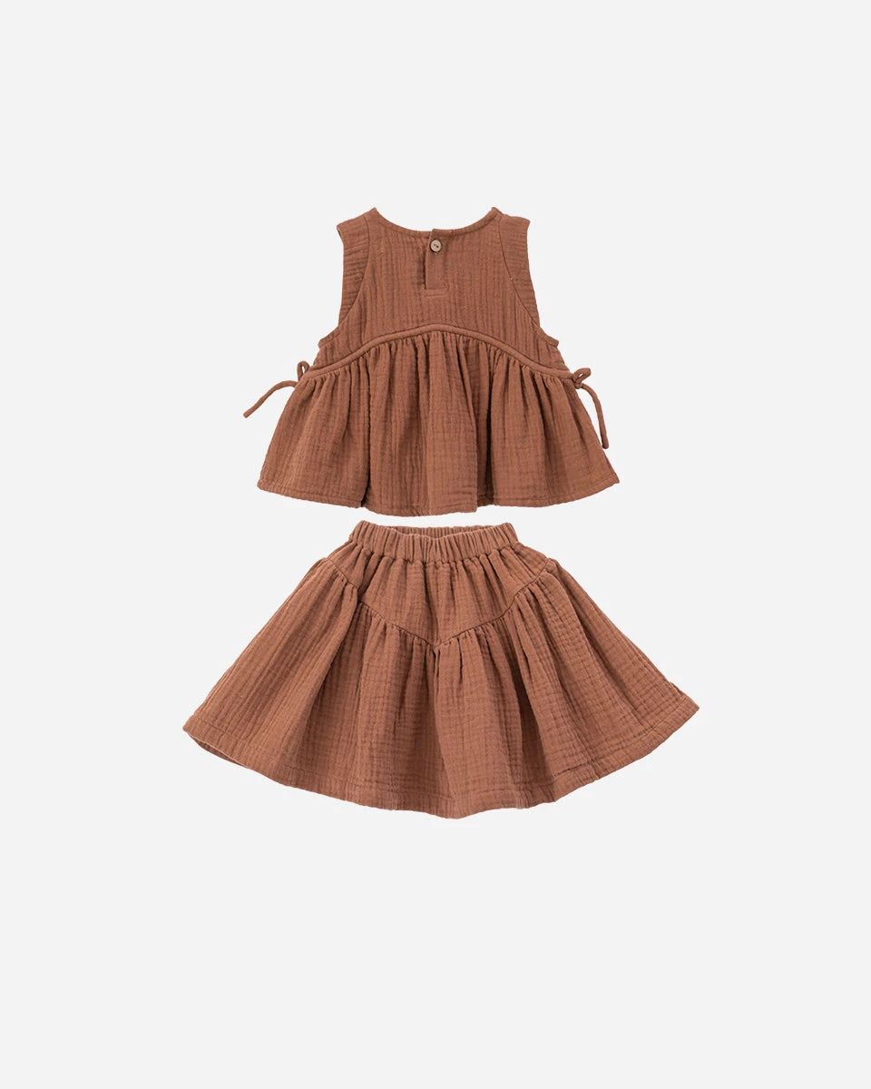 Lovely sets of flared top and skirt in soft 100% cotton muslin. This piece has adjustable drawstring on its top and two-tiered skirt design to add the statement.