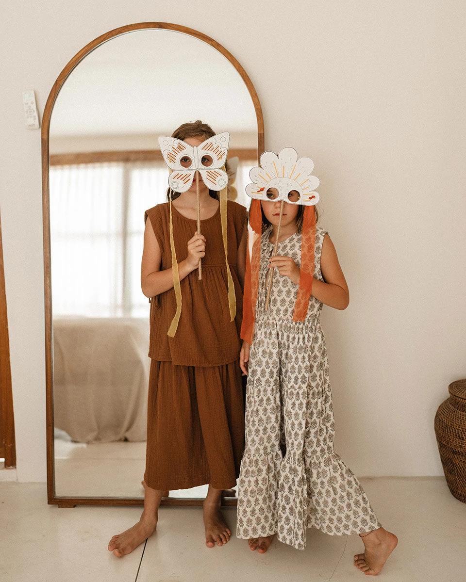 Features wooden button on the back of top and elasticated waistband on the skirt.