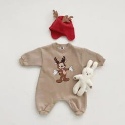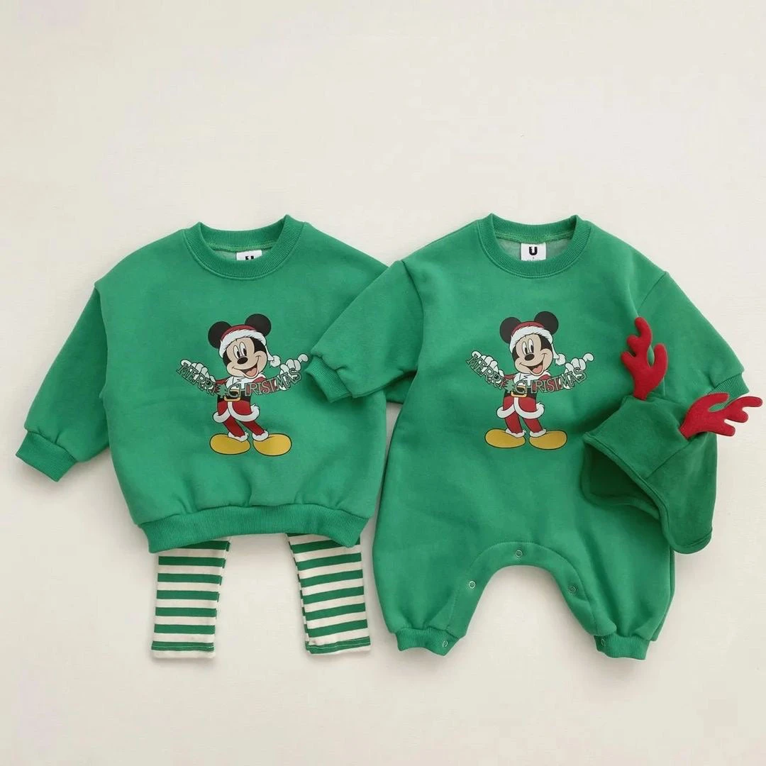 A perfectly oversized holiday crewneck romper featuring Minnie Mouse + Mickey Mouse!