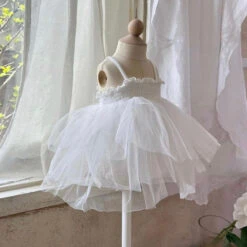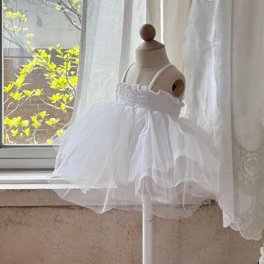 A sweet cotton gauze bodice romper featuring a tulle skirt overlay – adjustable tie back straps for the perfect fit.