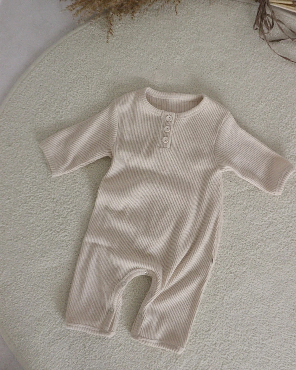 A classic ribbed playsuit featuring button up details and snap closures for fast and easy diaper changes.