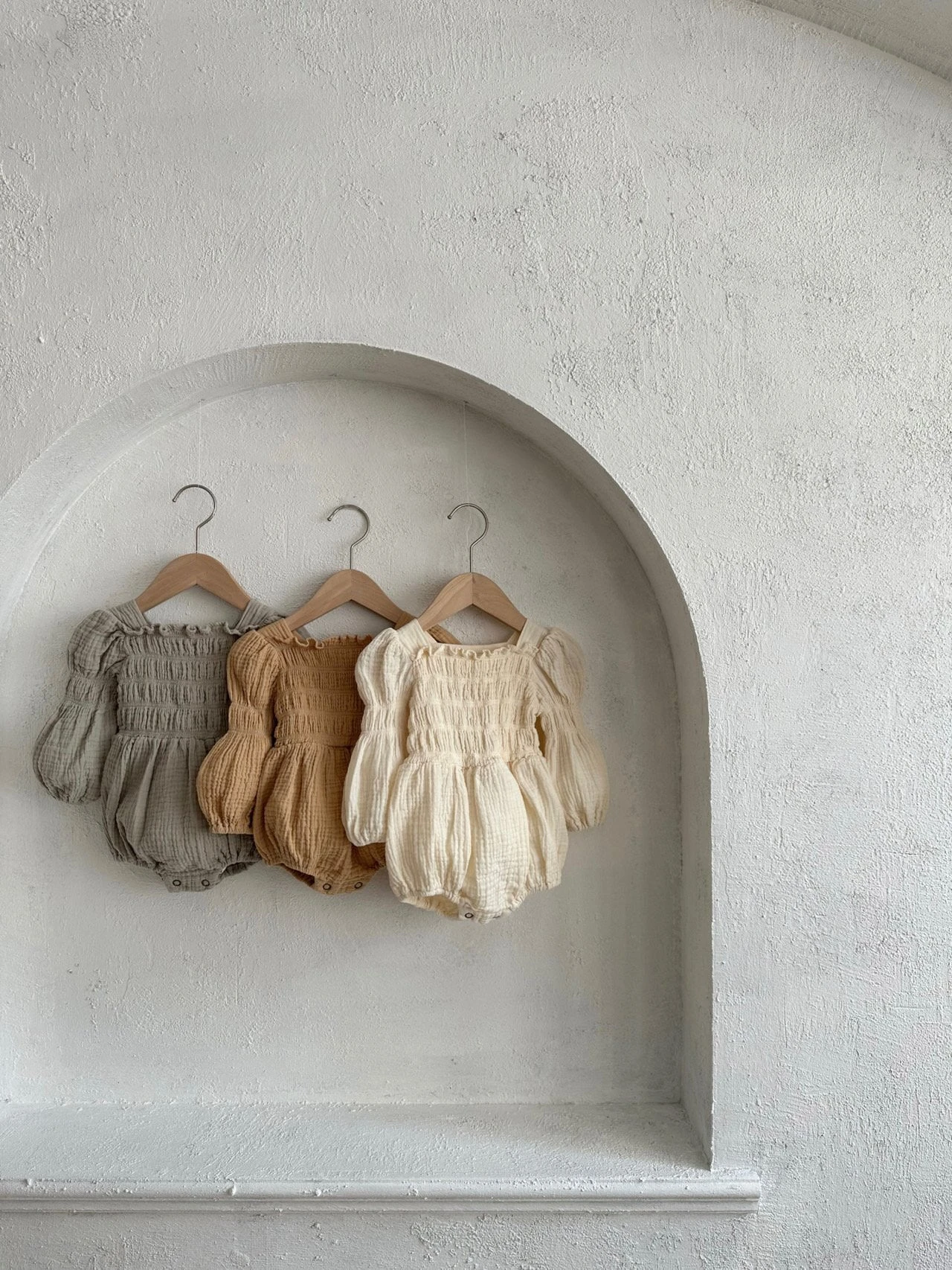 A beautiful gauze cotton romper featuring smocked details and puff sleeves – a sweet Mama + Mini look.