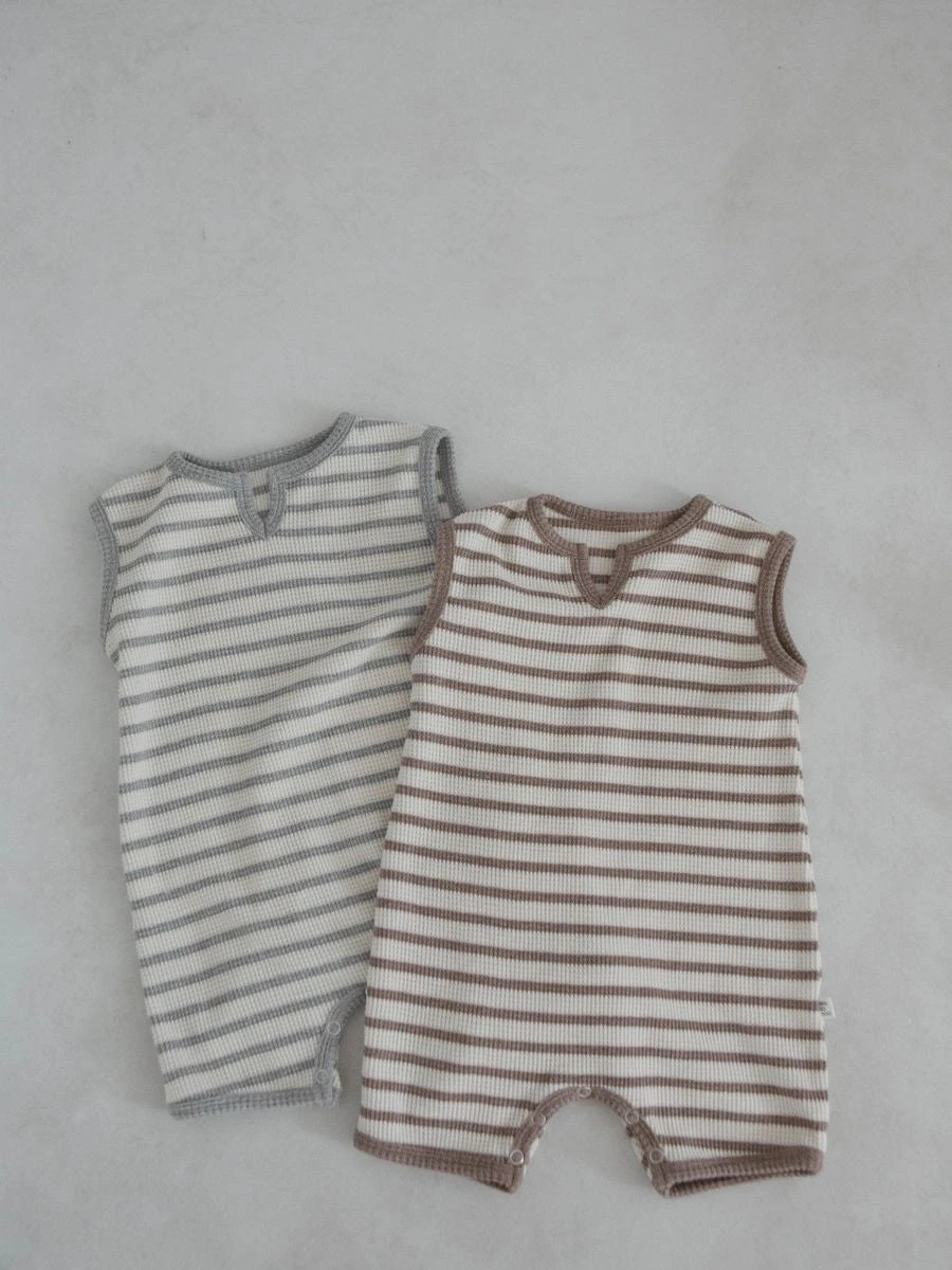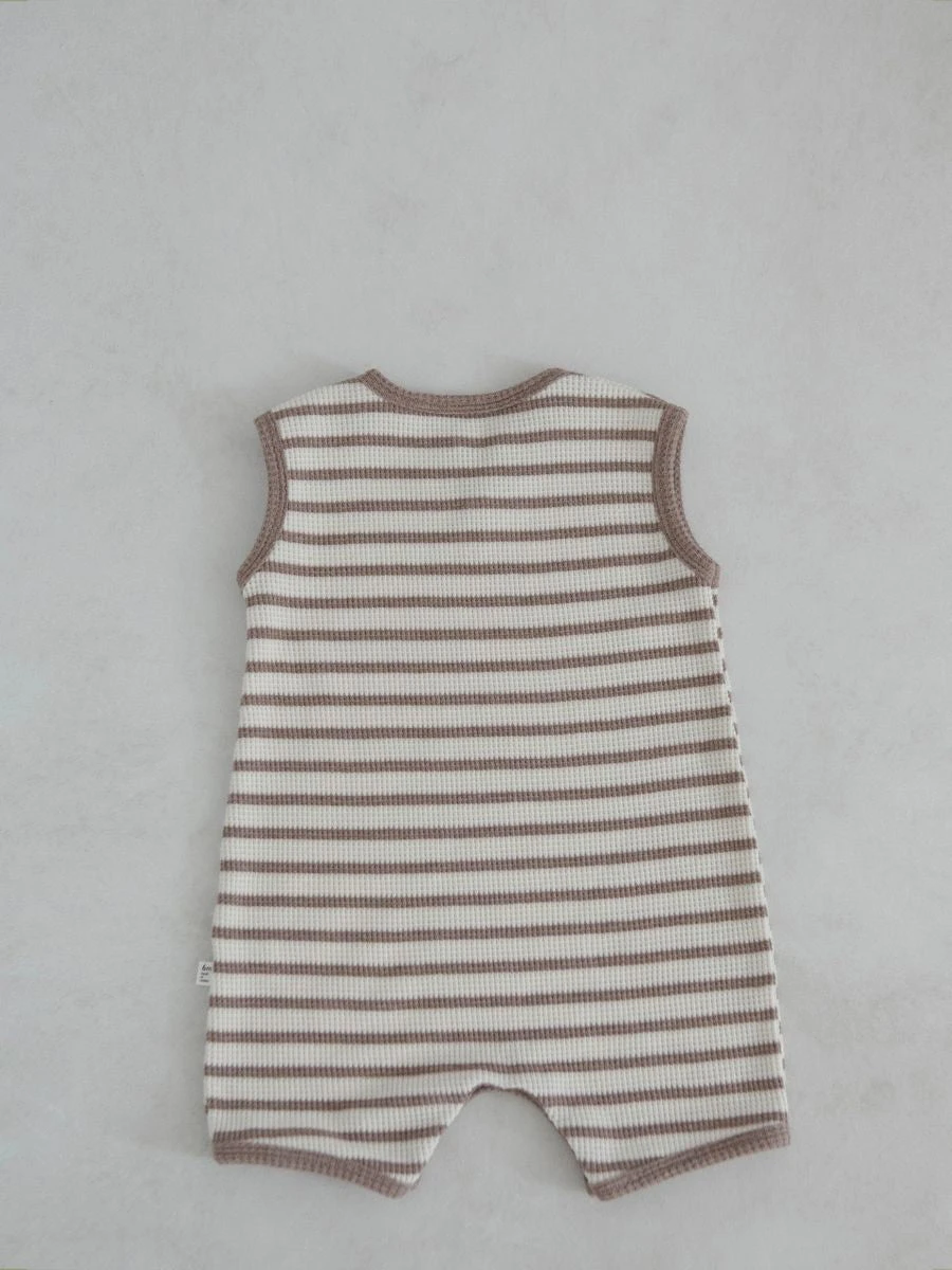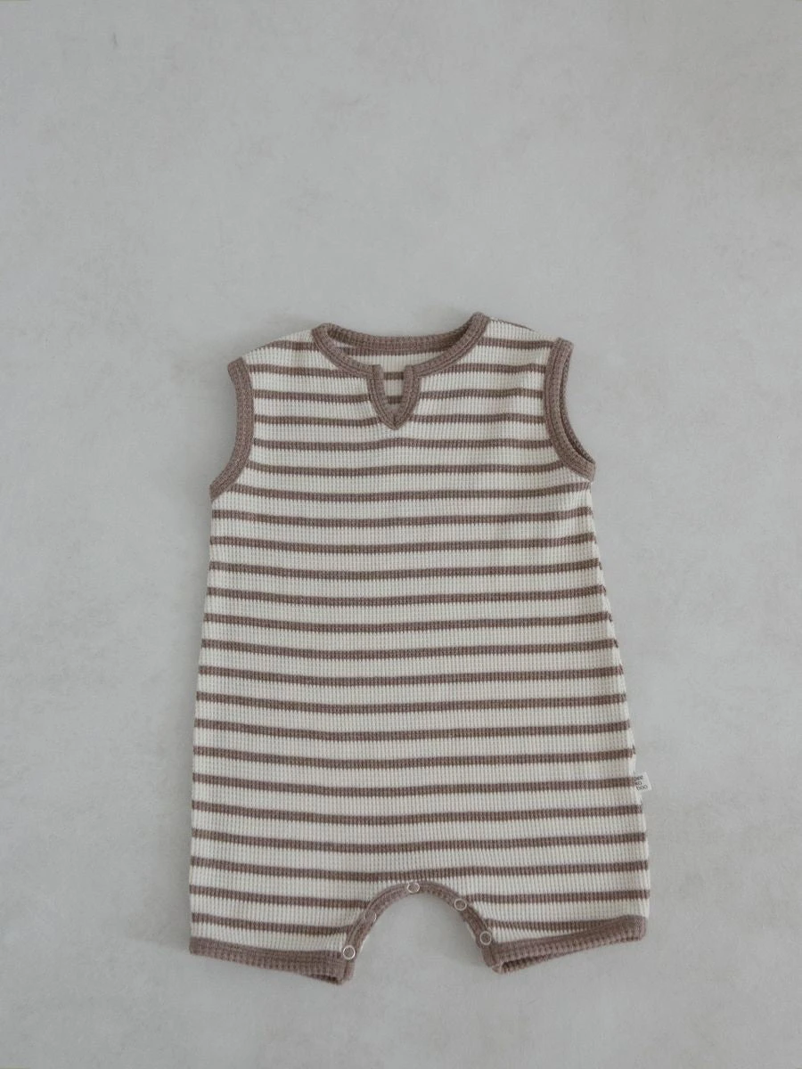 A sleeveless striped waffle romper featuring a slight v neck opening.