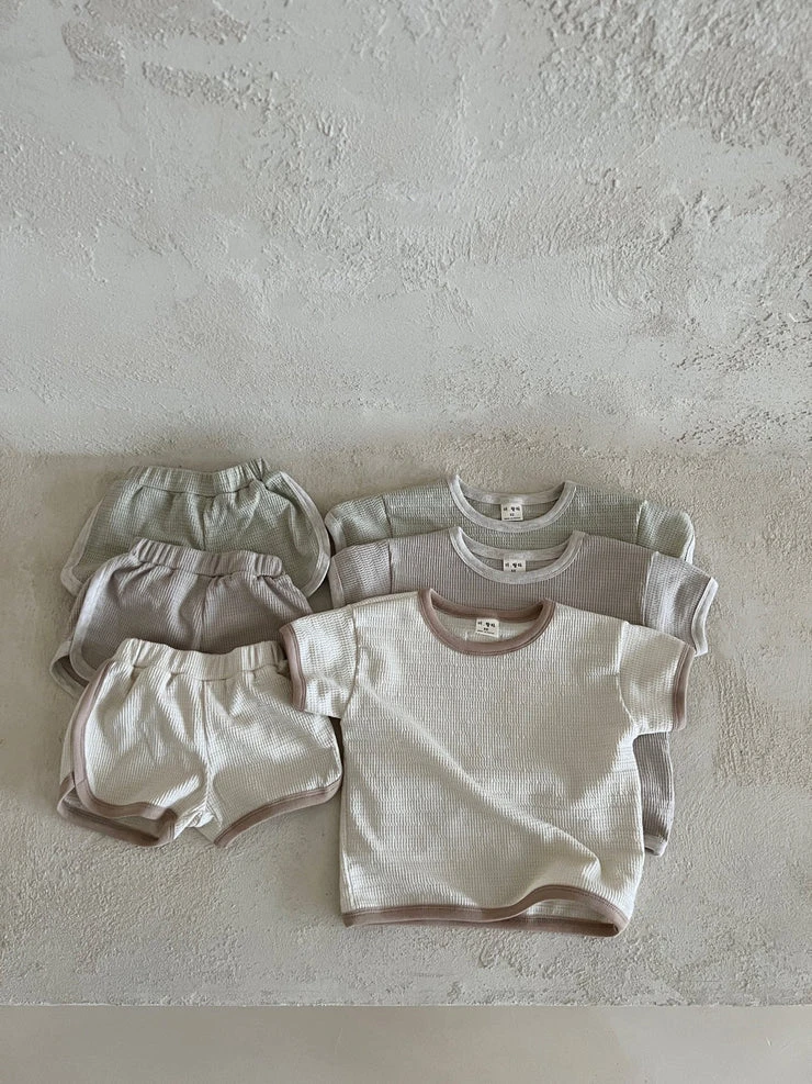 Short sleeved waffle top and matching shorts set featuring contrast trim details.