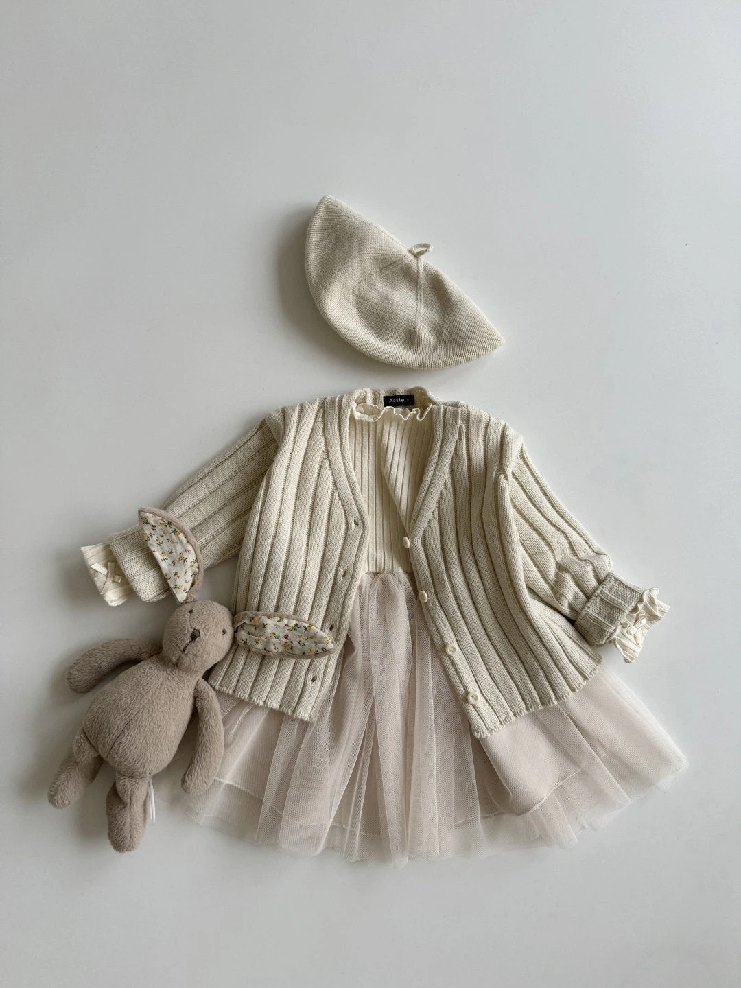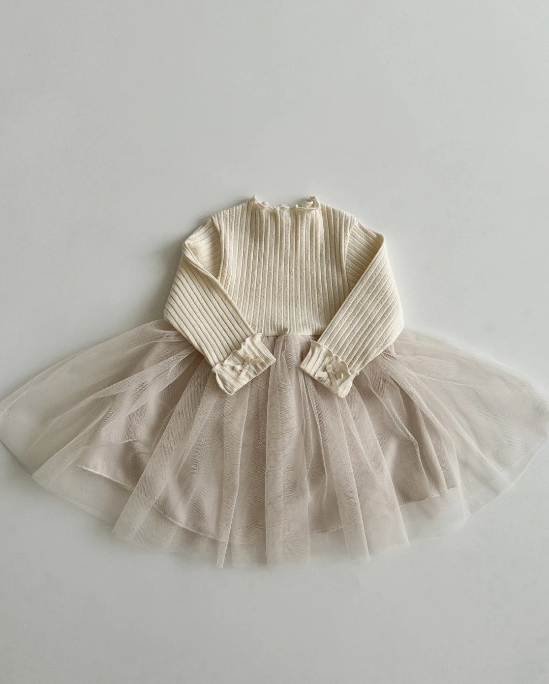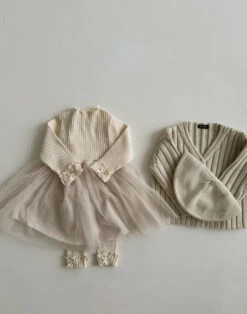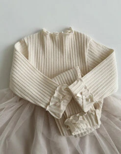 A sweet knit dress featuring a tutu skirt and lettuce trim details on the neckline. Matching leggings sold separately.