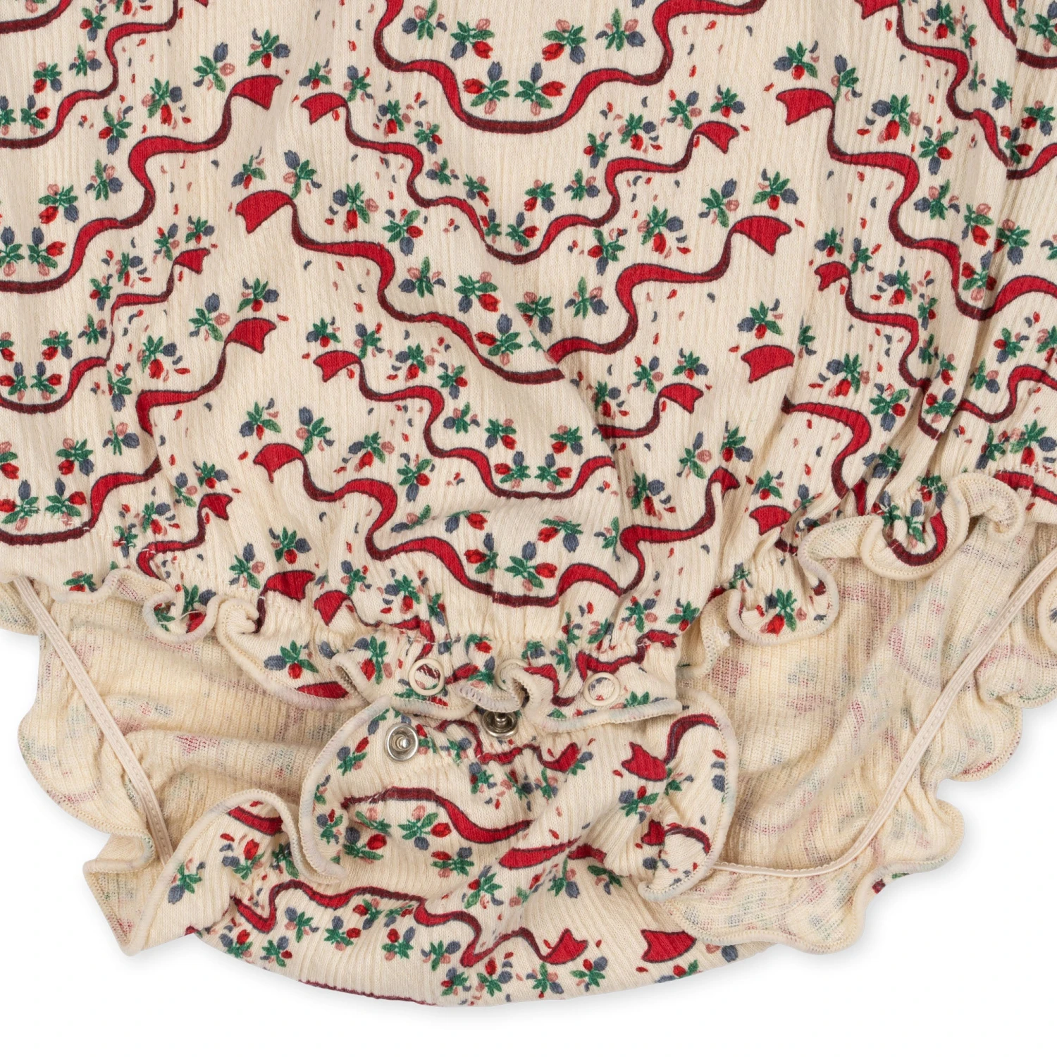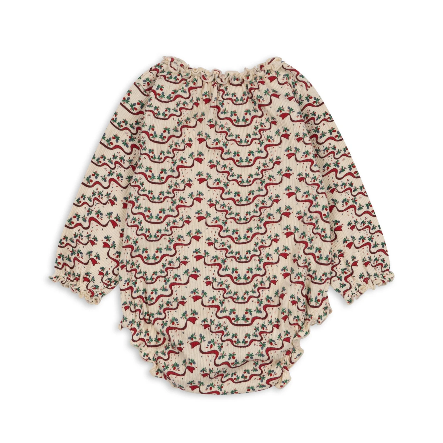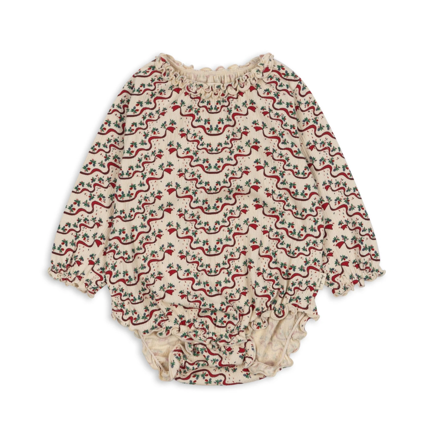 Soft long-sleeved body. Features frill details around the cuffs and thighs, and press buttons at the crotch for easy dressing.