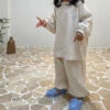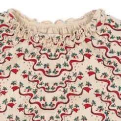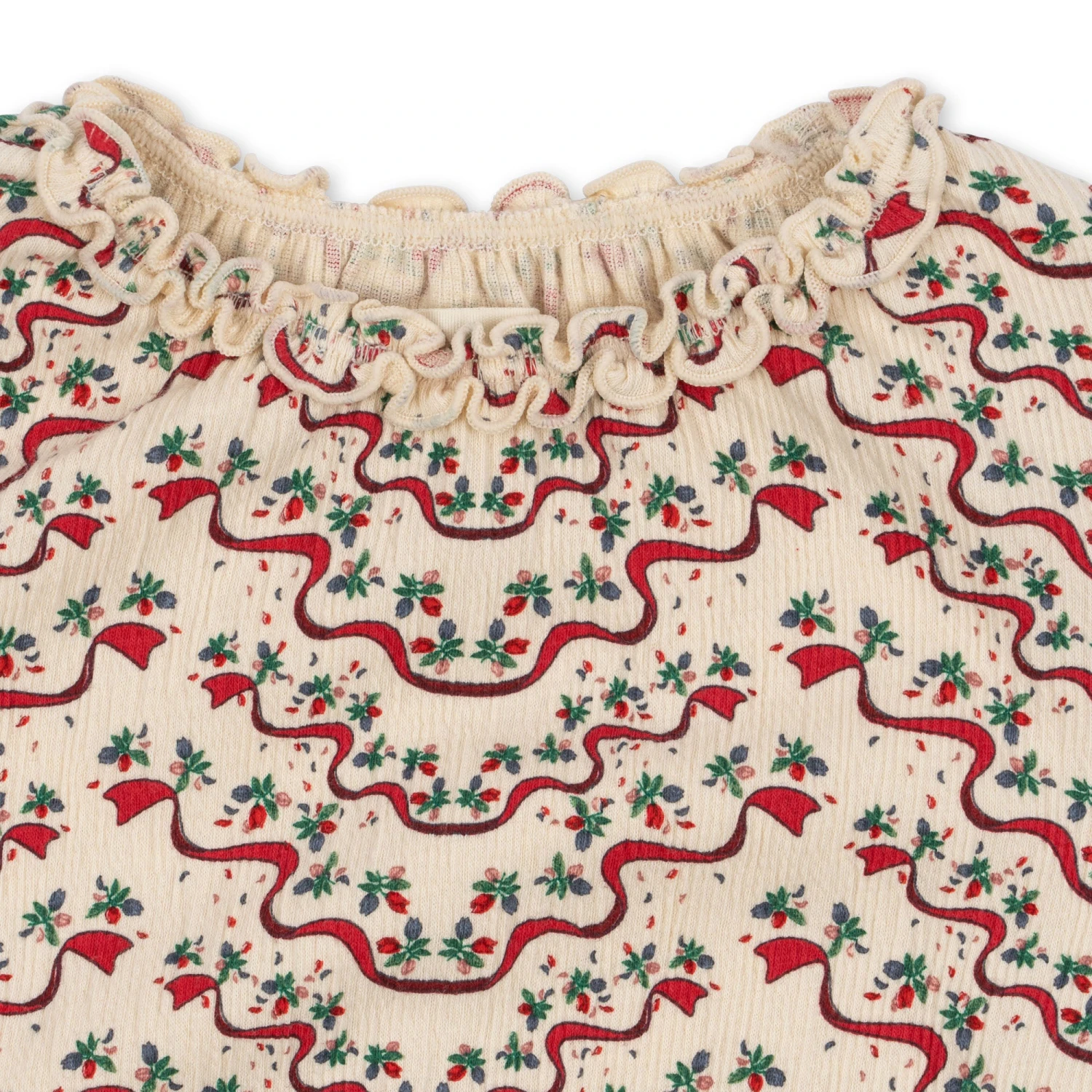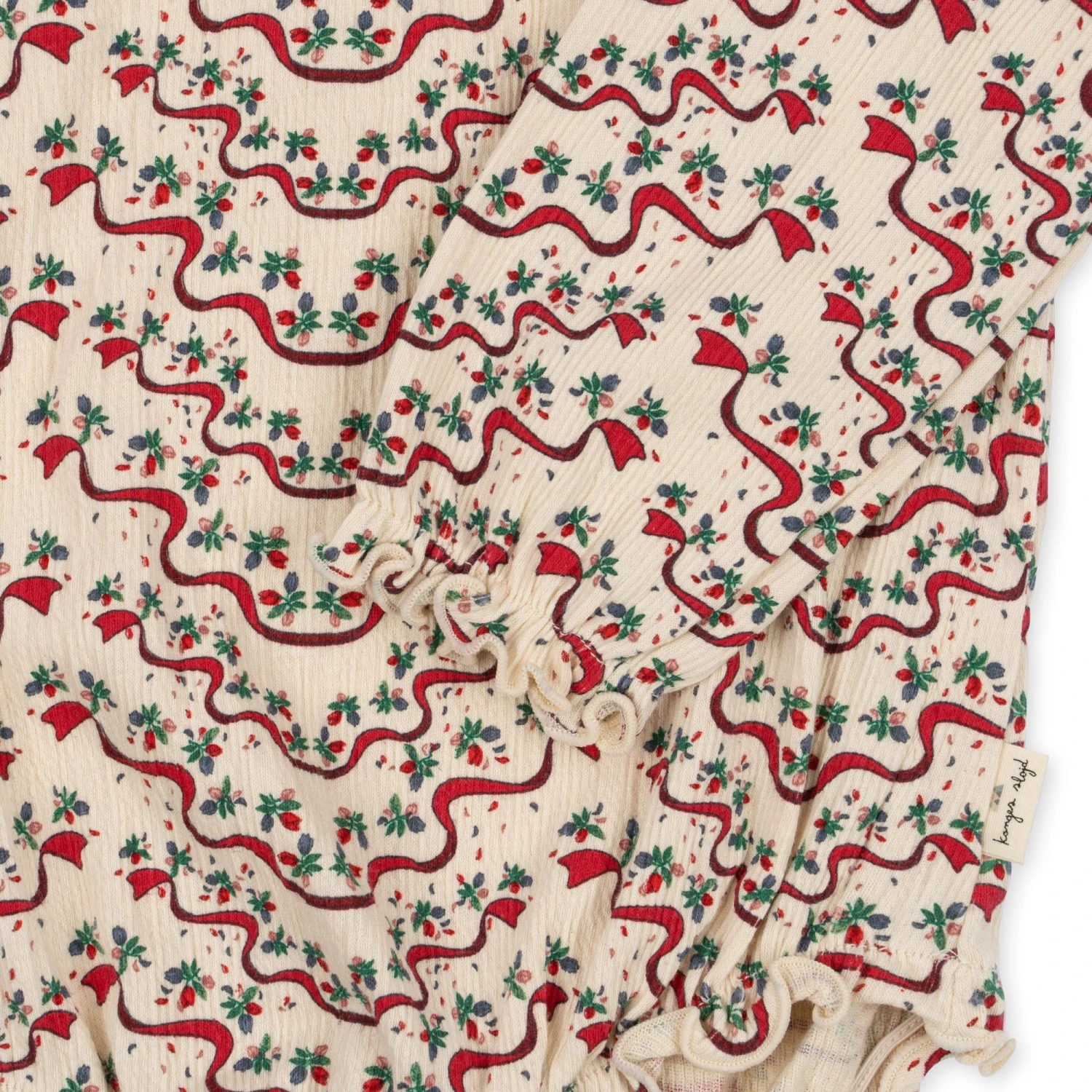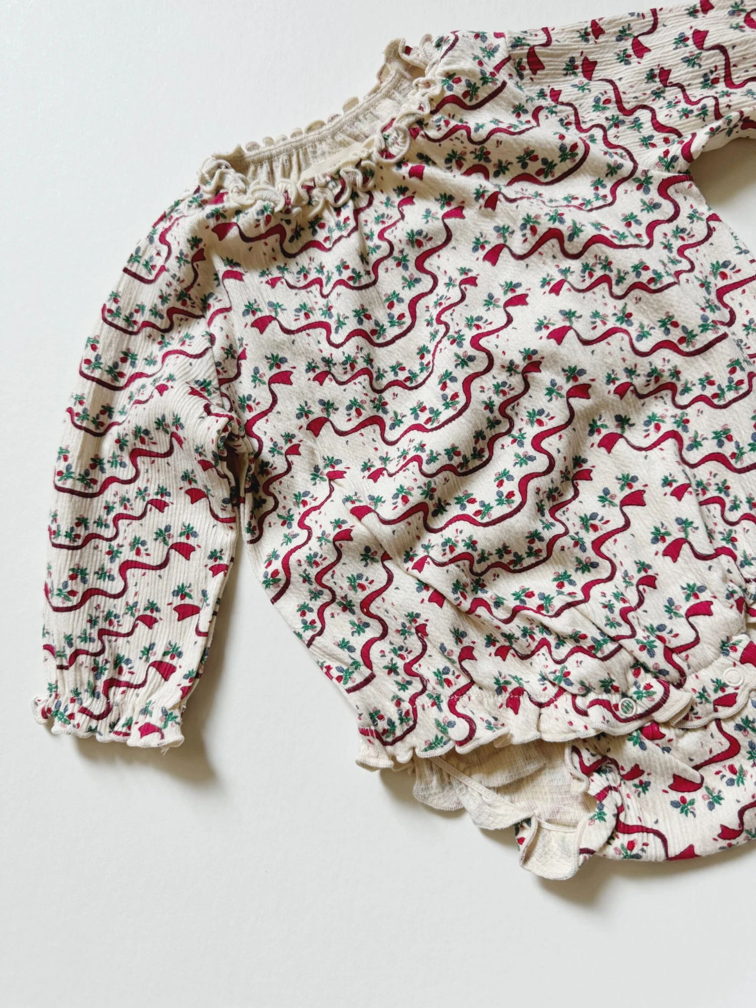 Soft long-sleeved body. Features frill details around the cuffs and thighs, and press buttons at the crotch for easy dressing.