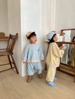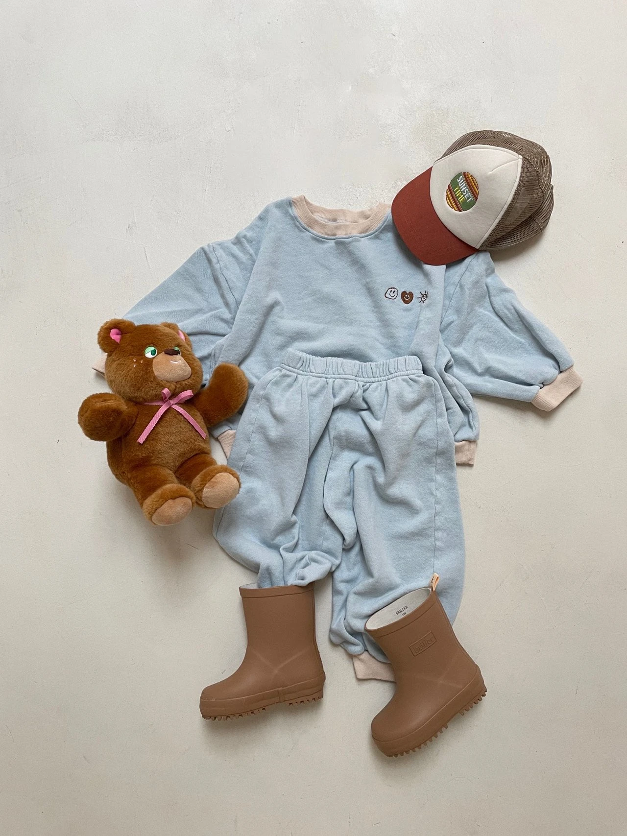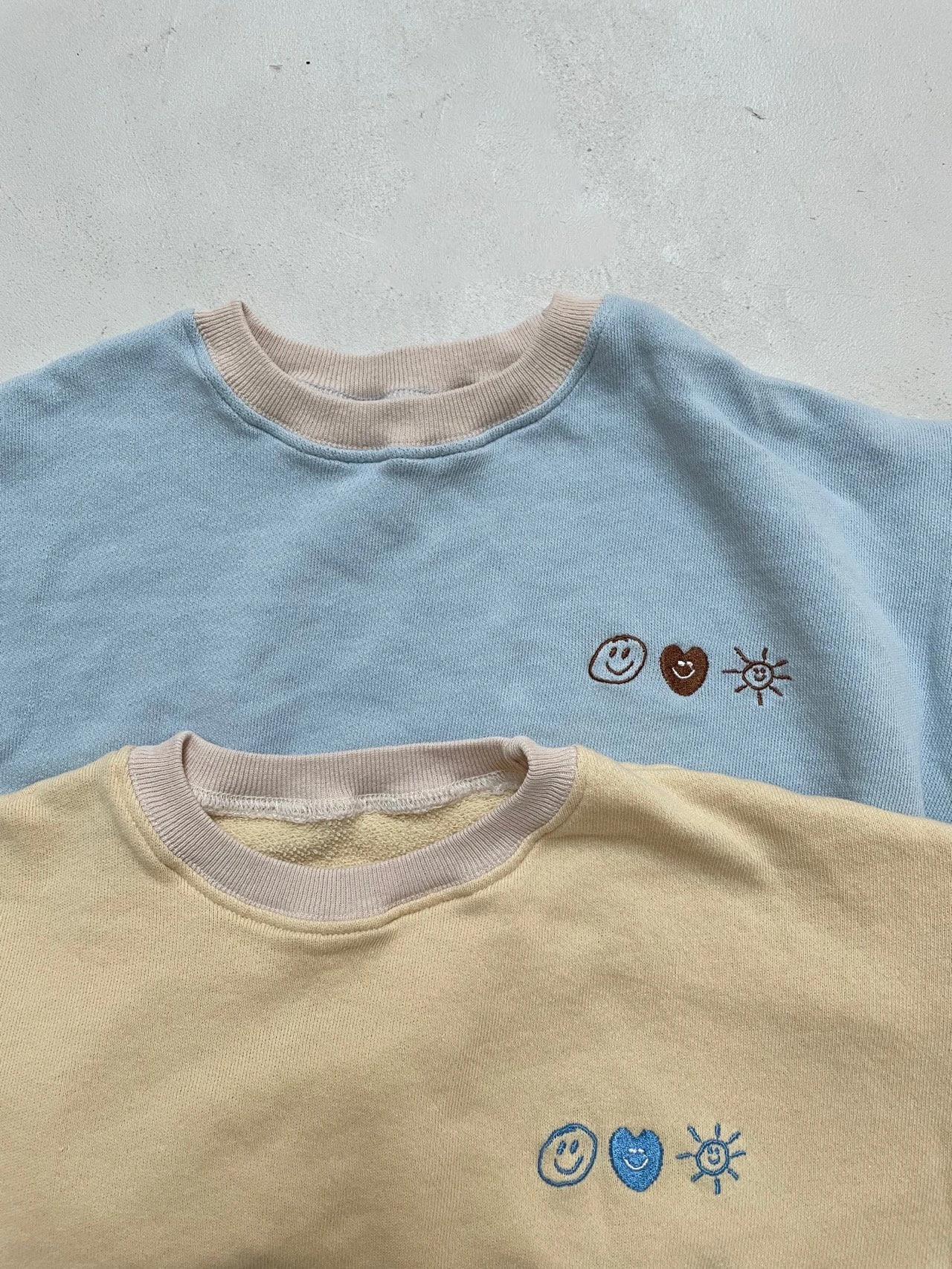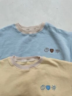 A perfectly oversized crewneck and matching joggers featuring happy embroidery details.