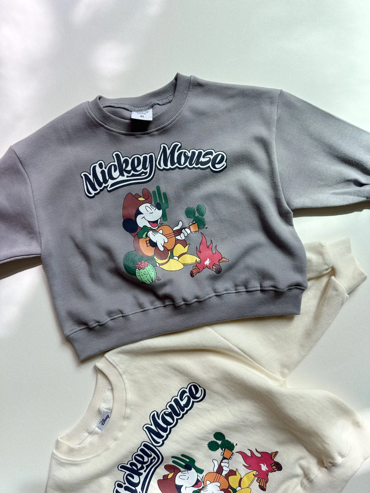 A lightweight crewneck sweatshirt featuring a cowboy Mickey Mouse graphic on the front.