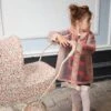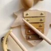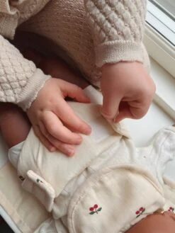 A set of 3 items which includes a bib, muslin cloth, and a diaper with a velcro closure for a doll.