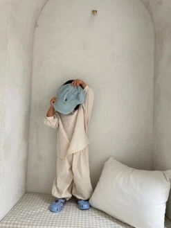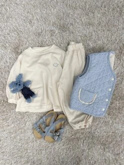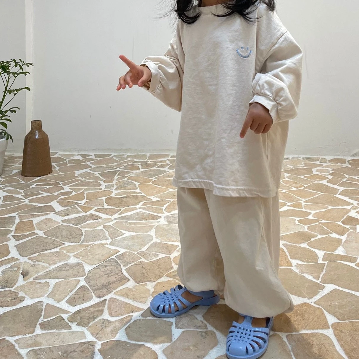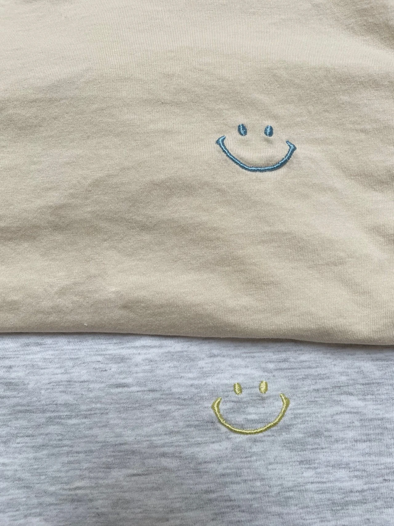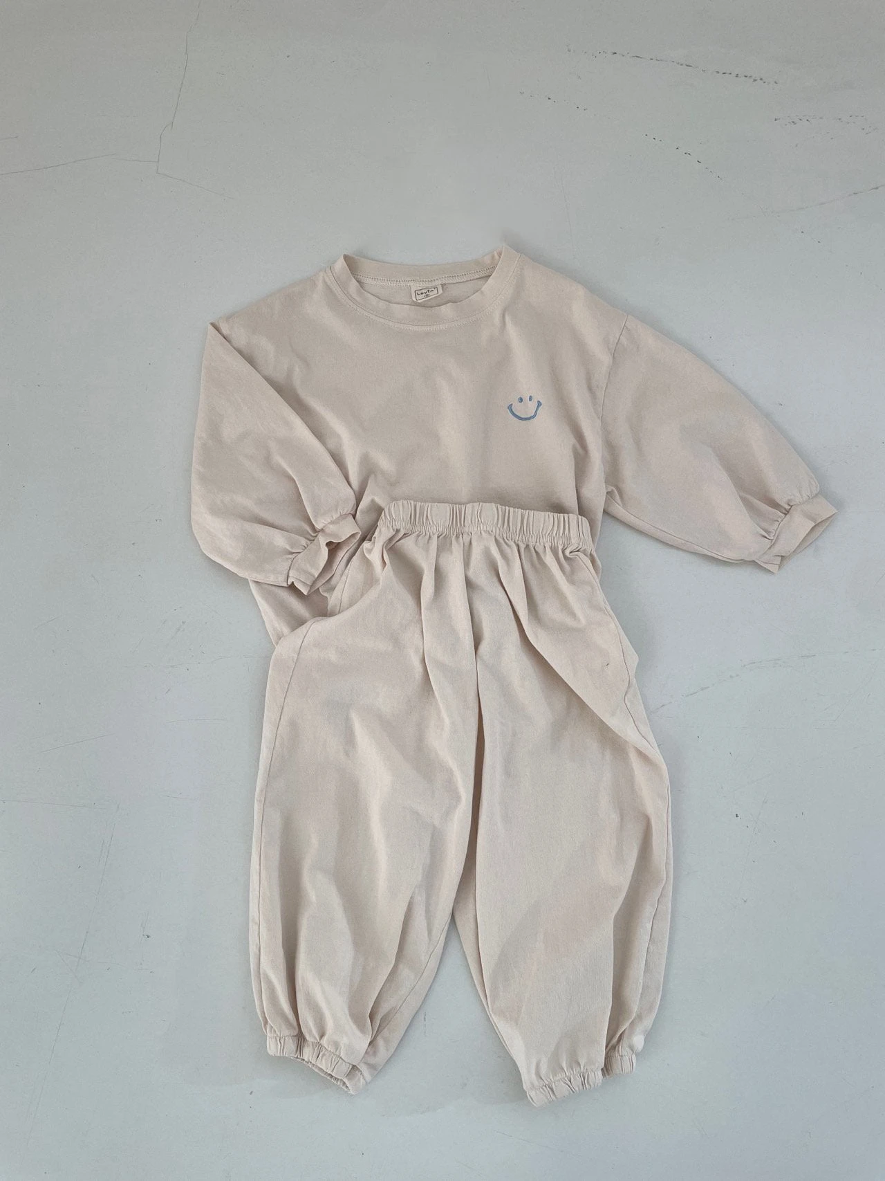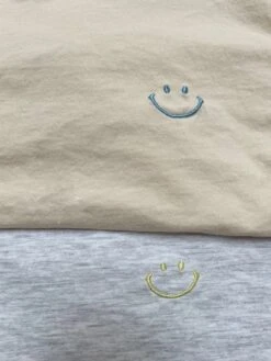 A comfy oversized tee featuring a happy face embroidery on the front and matching jogger pants.