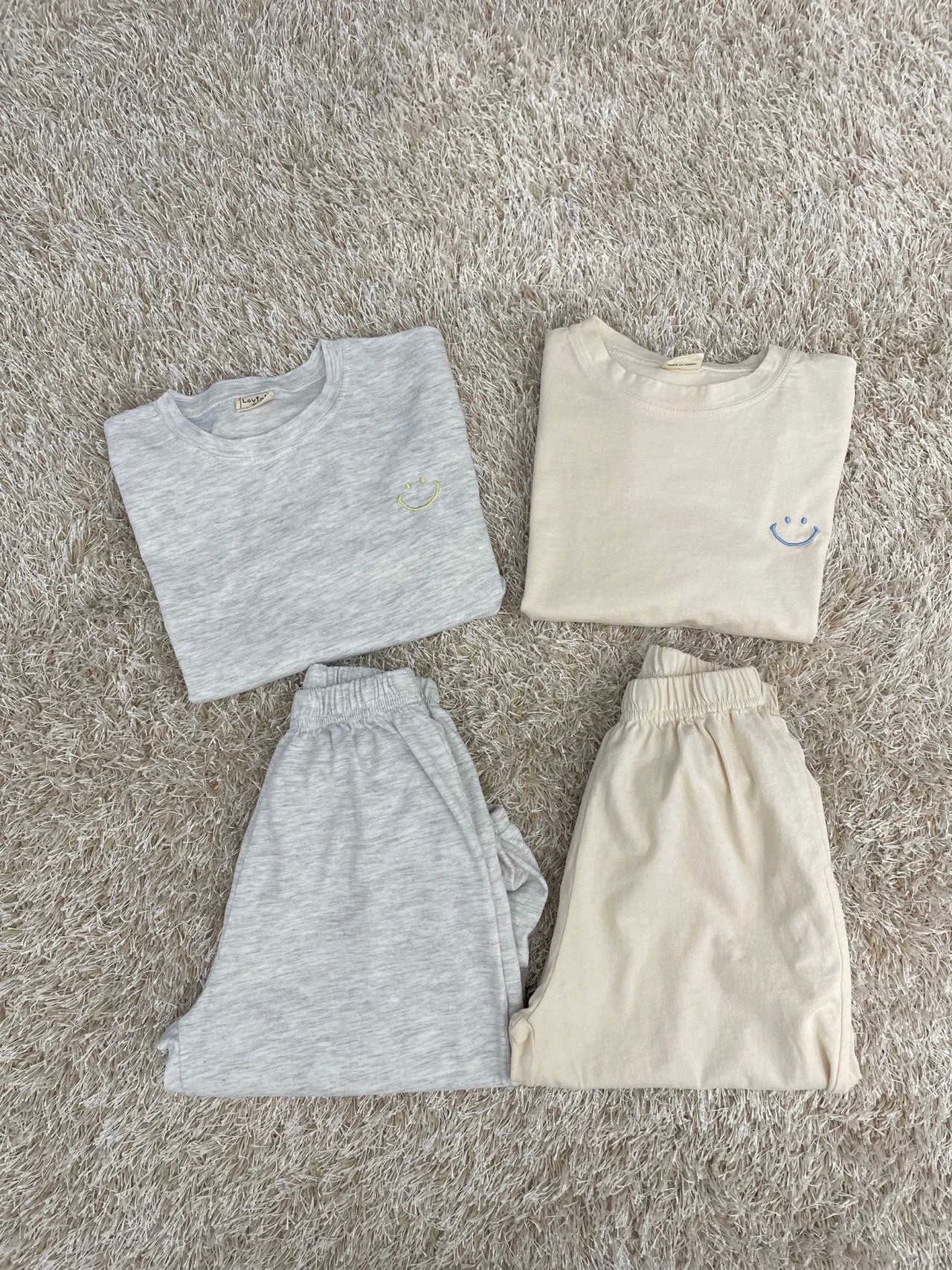 A comfy oversized tee featuring a happy face embroidery on the front and matching jogger pants.