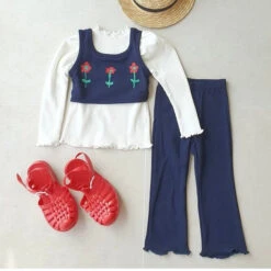 A sleeveless crop top and matching flared pants featuring lettuce trim details.