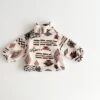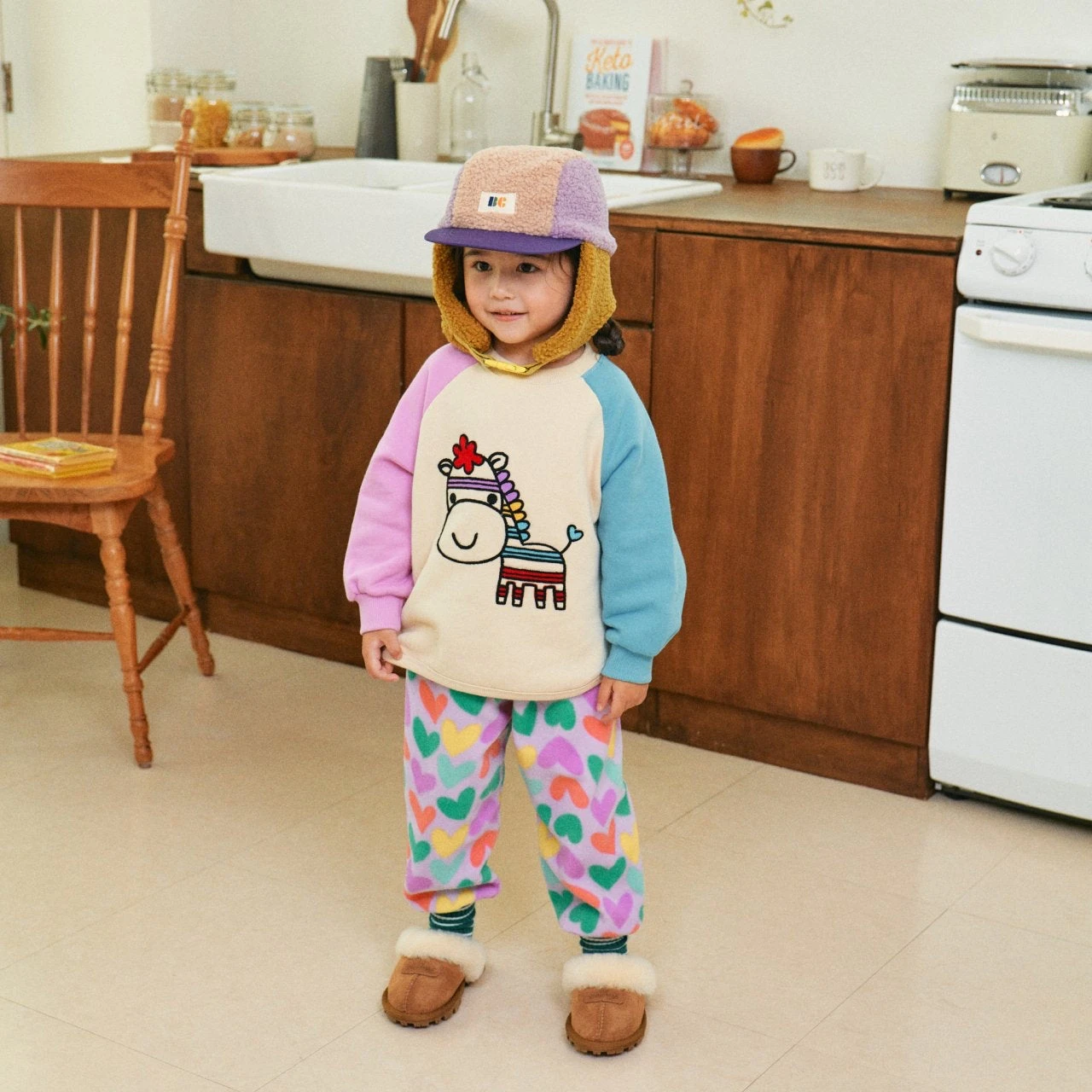 A cozy color block crewneck sweatshirts featuring a cute giraffe graphic.