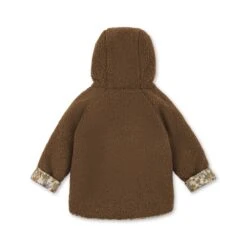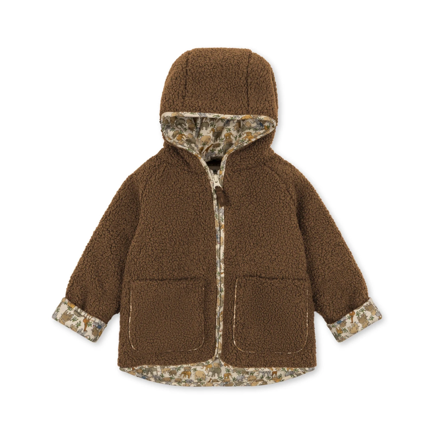Soft jacket made in 100% teddy polyester on the outside and woven cotton safari animal print on the inside. Designed with a hoodie, front pockets and zipper closure.