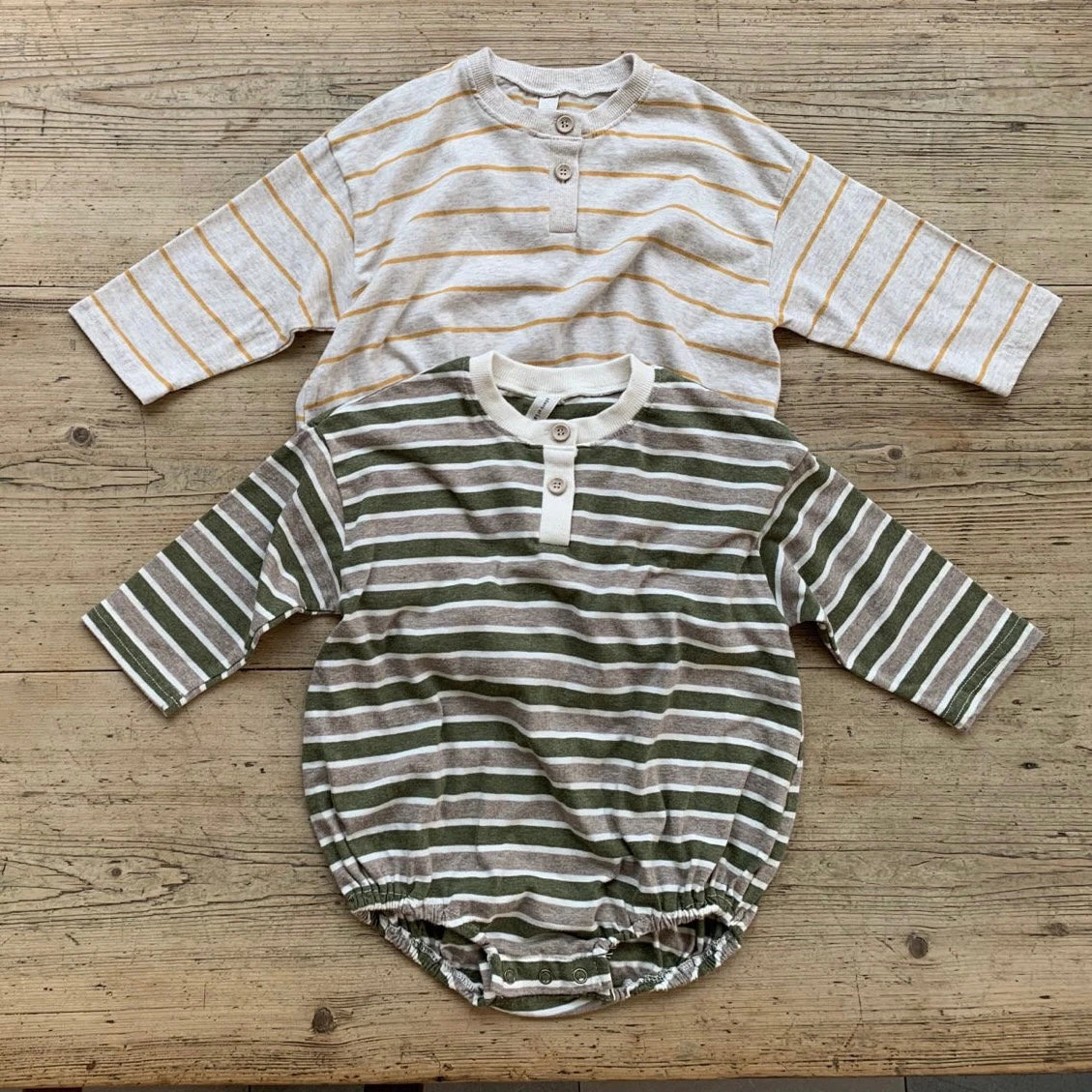 A perfectly oversized henley button up romper in a timeless striped pattern.