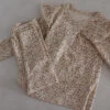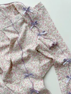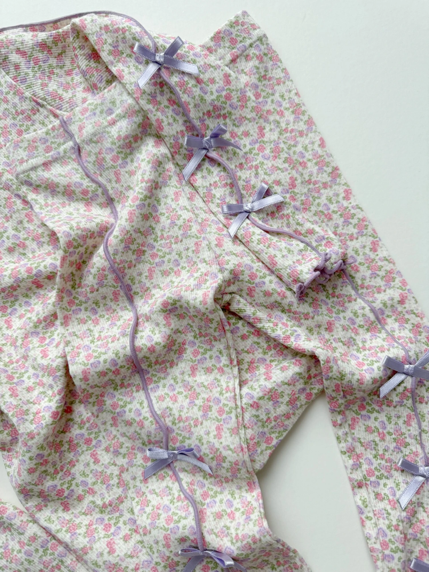 A floral print top and matching leggings featuring lettuce trim and bow details along the arms and legs.