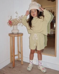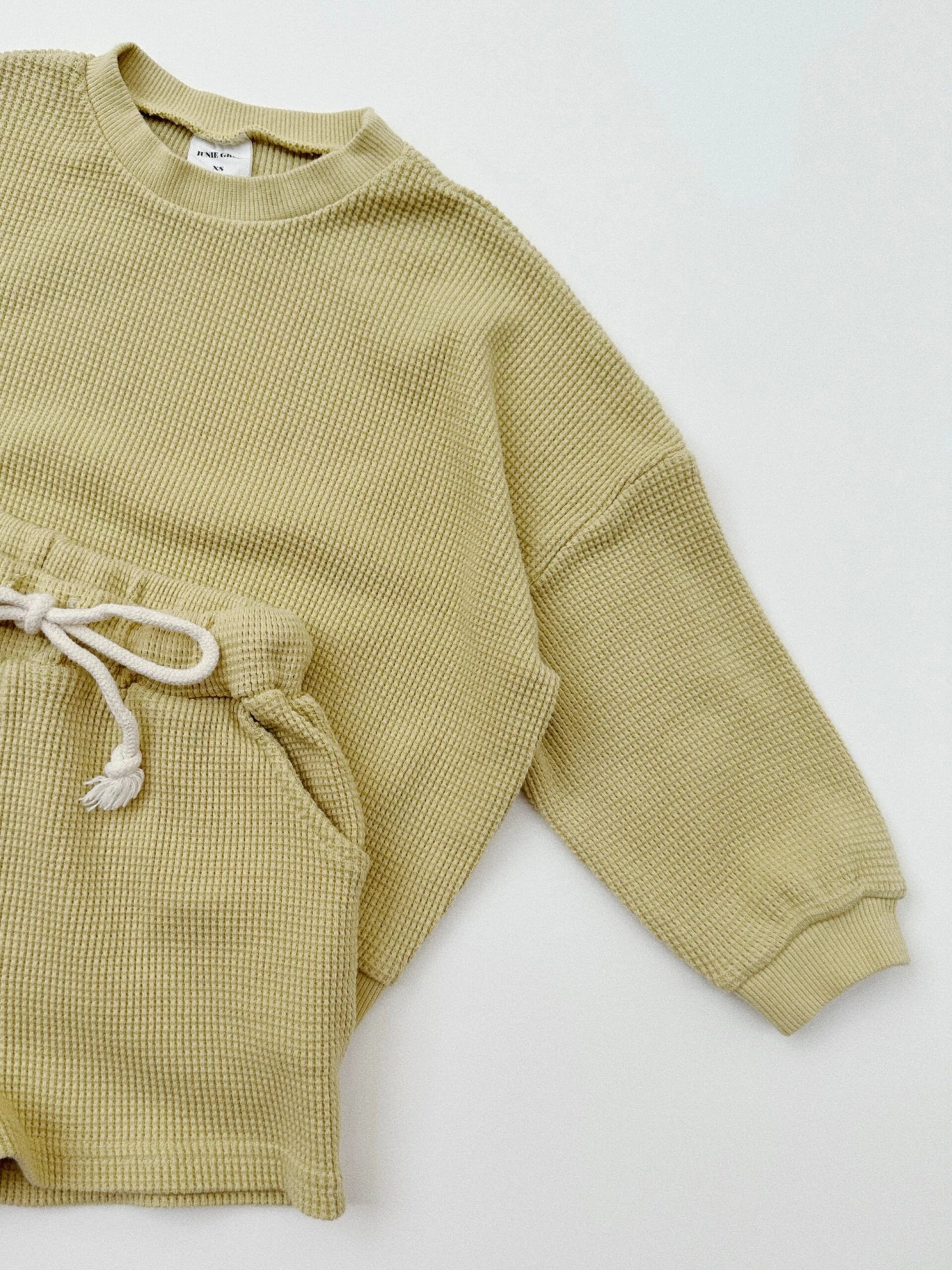 Mommy + Mini luxe waffle sets to live in this season. A perfectly oversized crewneck top featuring matching shorts w/pockets for a stylish cozy outfit.