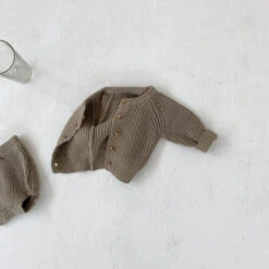 This cotton knit button up cardigan features matching knit bloomers. The perfect transitional set to wear through fall and this winter season.