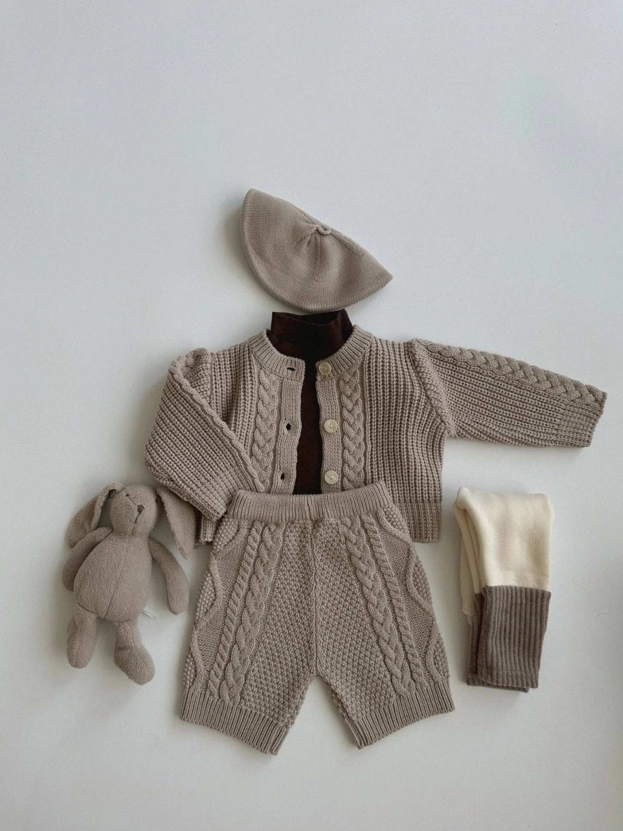 A cozy button up knit cardigan. Matching pants available, sold separately.