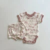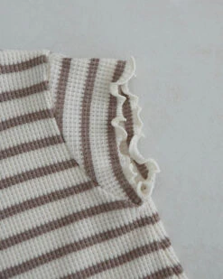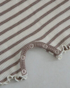 Our favorite waffle fabrication in a timeless short sleeved striped pattern featuring sweet lettuce trim detail. Bottom snap closures make it easy for changing on the go.