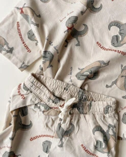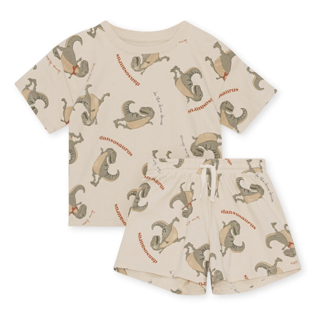 | 2-piece set made in 100 percent organic GOTS certified cotton. The set consists of a t-shirt and shorts with a soft elasticated waist and an elastic drawstring waistband. |