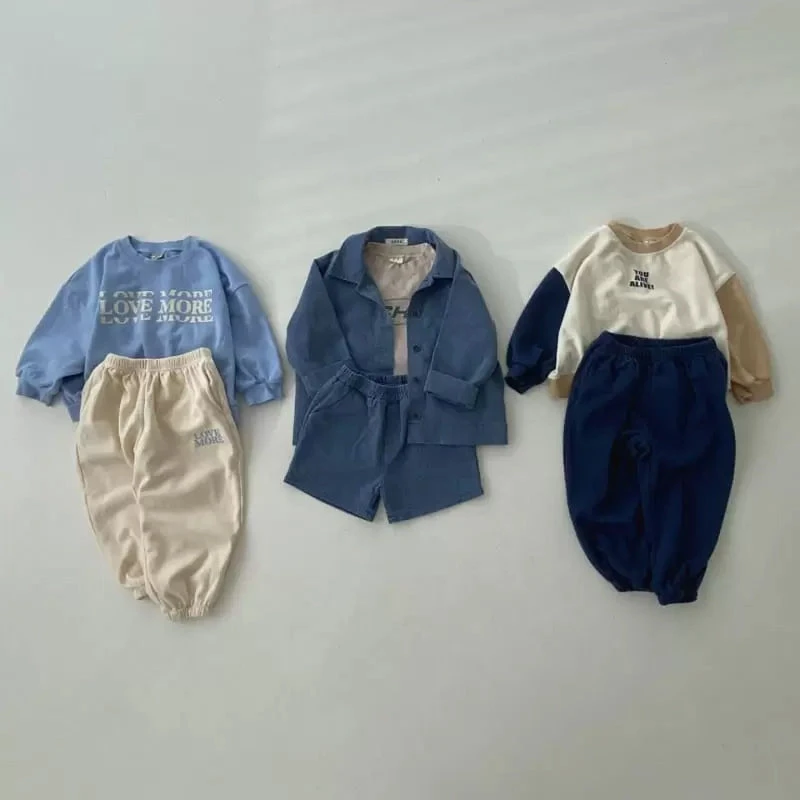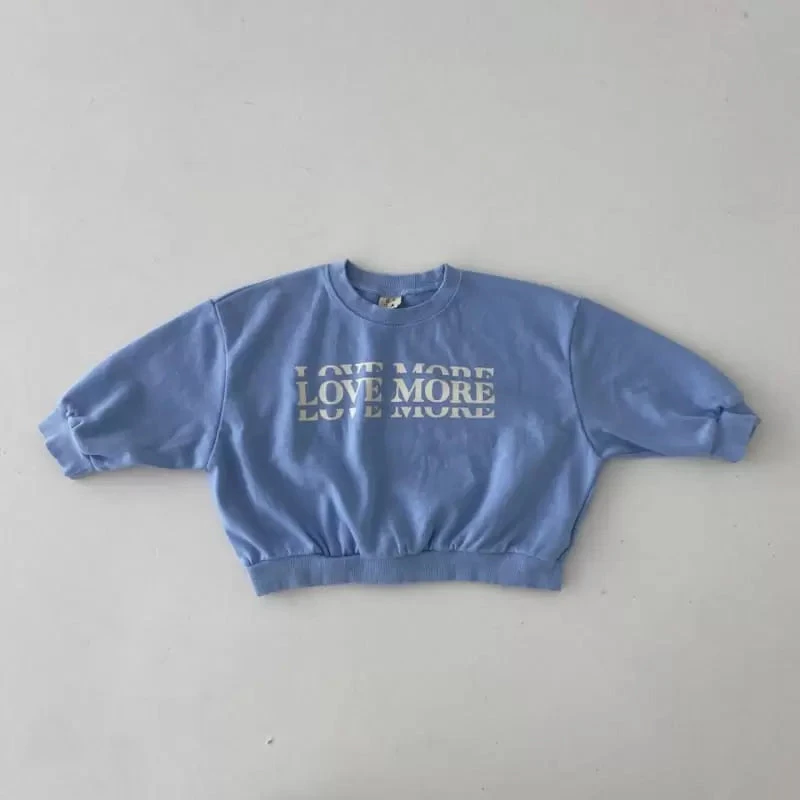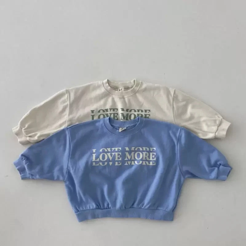 A perfectly oversized crewneck sweatshirt and matching joggers featuring “love more” graphics.