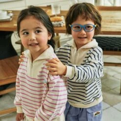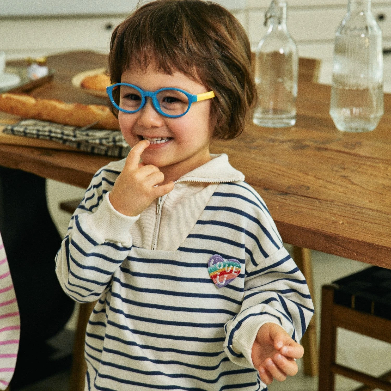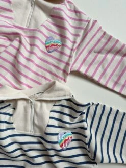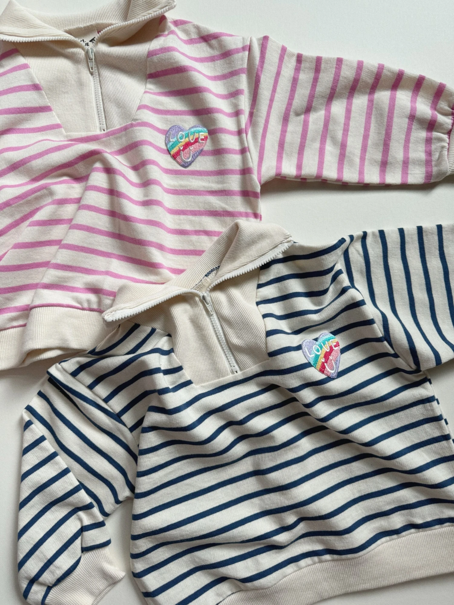 A perfectly oversized striped quarter zip sweatshirt featuring “LOVE U” heart patch.