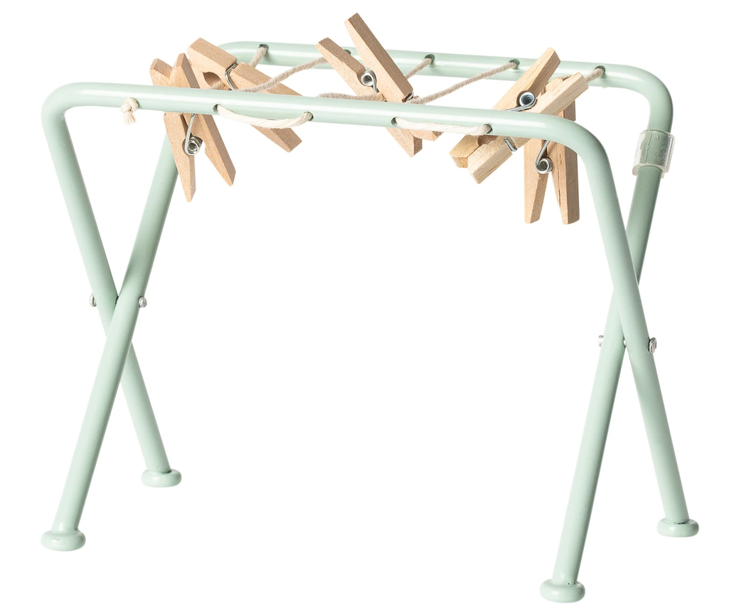 Our new, smaller clothes drying rack is sized right for our micro friends and a perfect fit for the dollhouse. Includes 6 pegs and is painted light aqua.