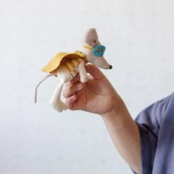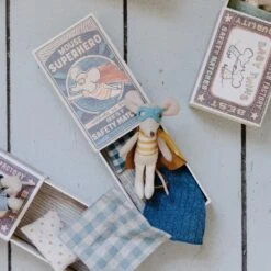 He has an off-white and yellow striped shirt along with his tights, so he can move swiftly through the air. He has a shimmery gold faux suede cape which makes him look extra heroic while flying. He wears a bright blue mask while awake and active, and he even comes with a dark yellow sleeping mask, so can rest peacefully after an exciting day of watching over his Maileg friends. Our Little Brother Superhero arrives in a brilliant and colorful matchbox.