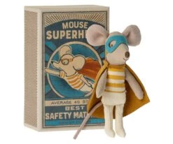 He has an off-white and yellow striped shirt along with his tights, so he can move swiftly through the air. He has a shimmery gold faux suede cape which makes him look extra heroic while flying. He wears a bright blue mask while awake and active, and he even comes with a dark yellow sleeping mask, so can rest peacefully after an exciting day of watching over his Maileg friends. Our Little Brother Superhero arrives in a brilliant and colorful matchbox.