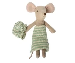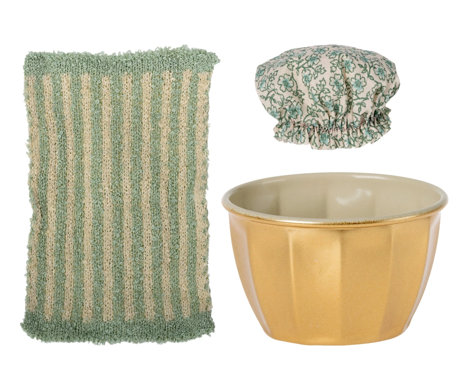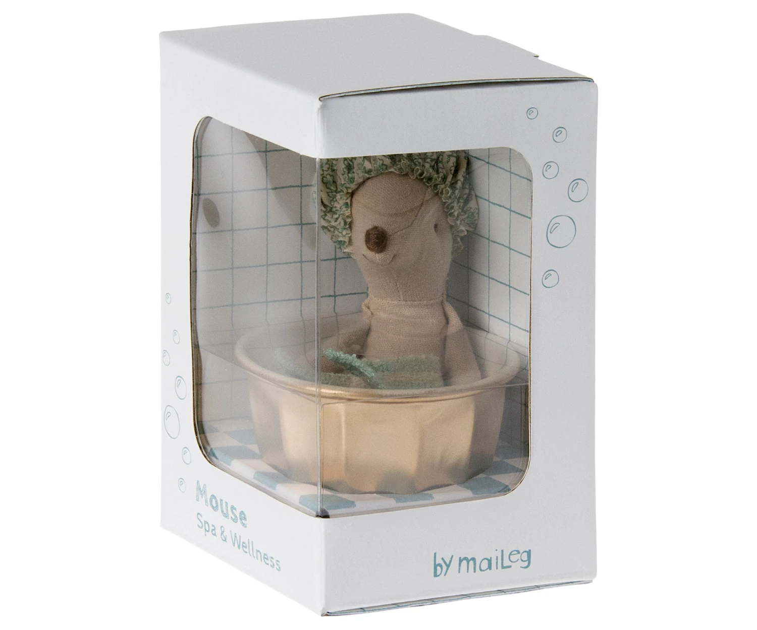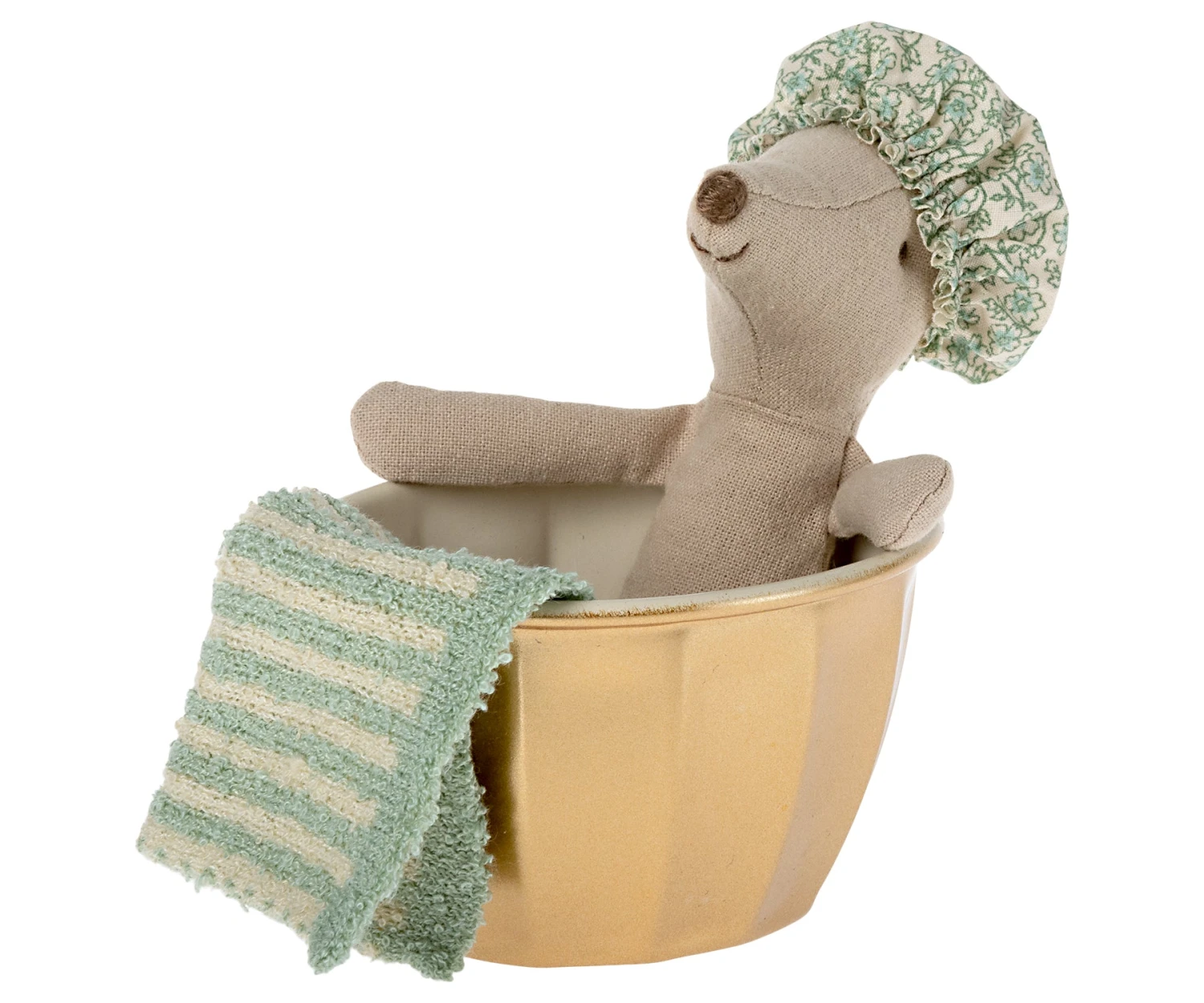 Rub a Dub Dub there is a mouse in the tub. Ms. Mouse gets squeaky clean in the tub, but her ears stay dry with her shower cap. She uses a cute gold metal cup for her tub. Every mouse needs a spa day!