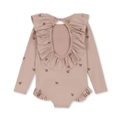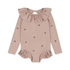 | Long sleeve swimsuit designed with a large, rounded frill collar and frill details at the leg openings, made from recycled plastic bottles. The suit features an open back with frills and a tie string at the back neck. Made with snap buttons in the diaper area, for the little ones – sizes 3M-24M Made of recycled polyester and elastane. Cleaning instructions: (same for all swin) CE marked |
