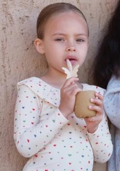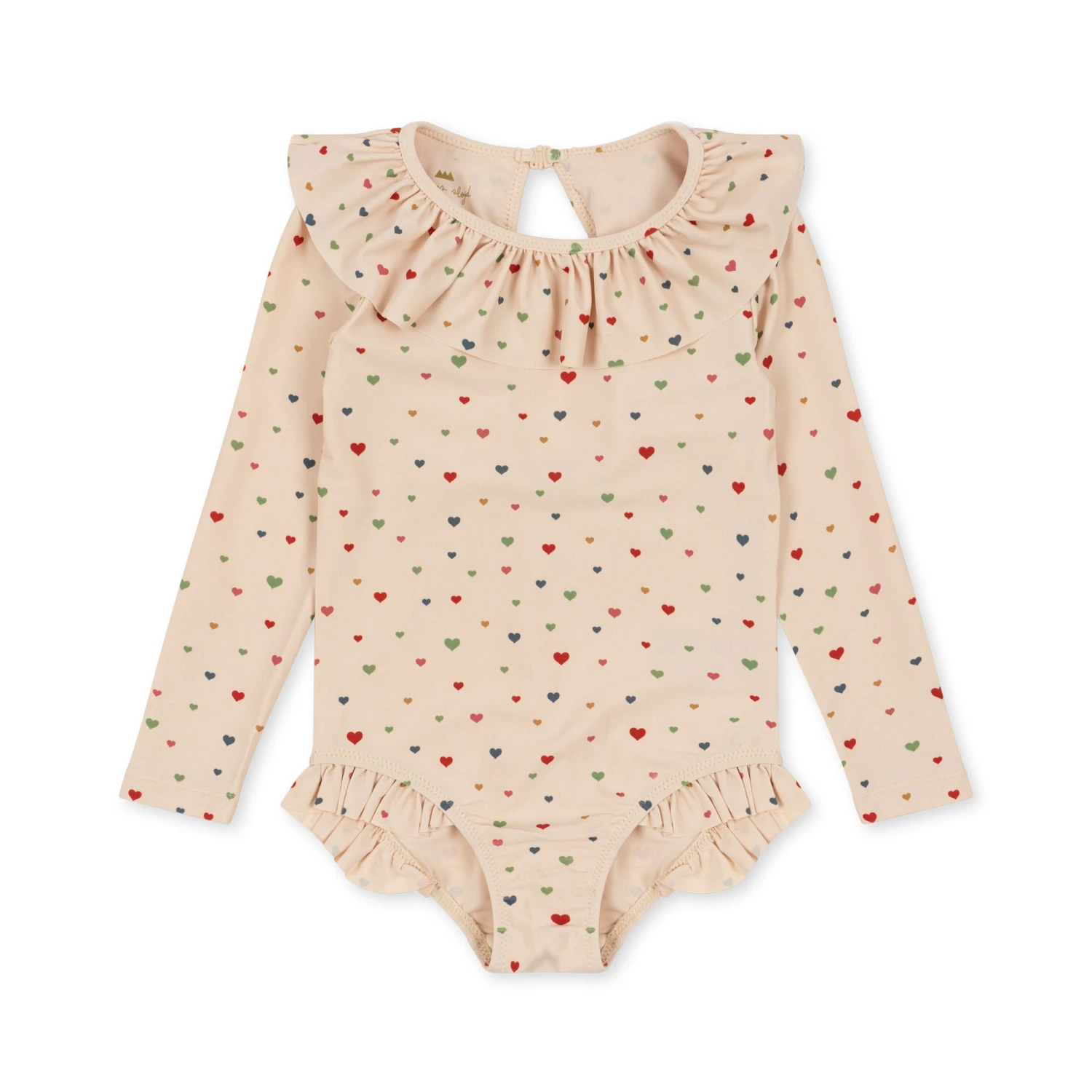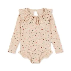 Long sleeve swimsuit designed with a large, rounded frill collar and frill details at the leg openings, made from recycled plastic bottles. The suit features an open back with frills and a tie string at the back neck.