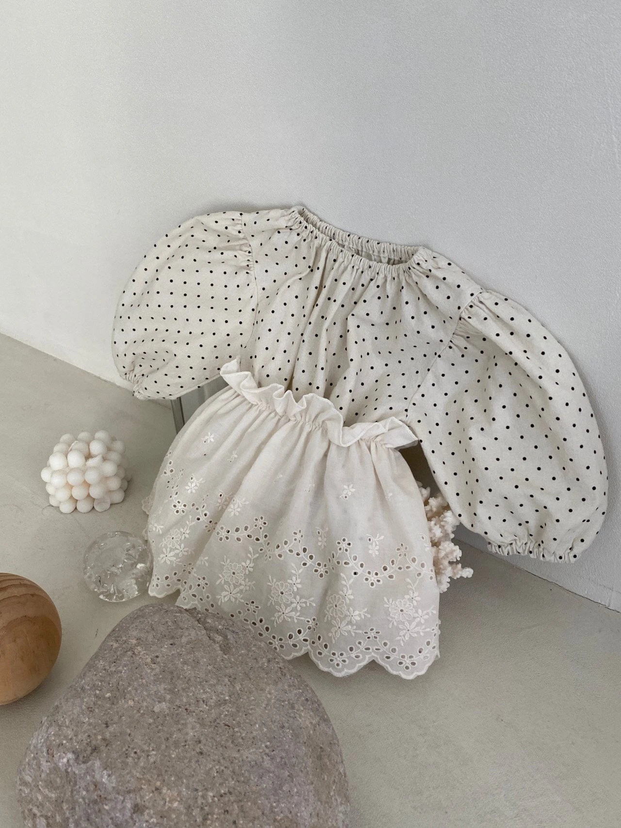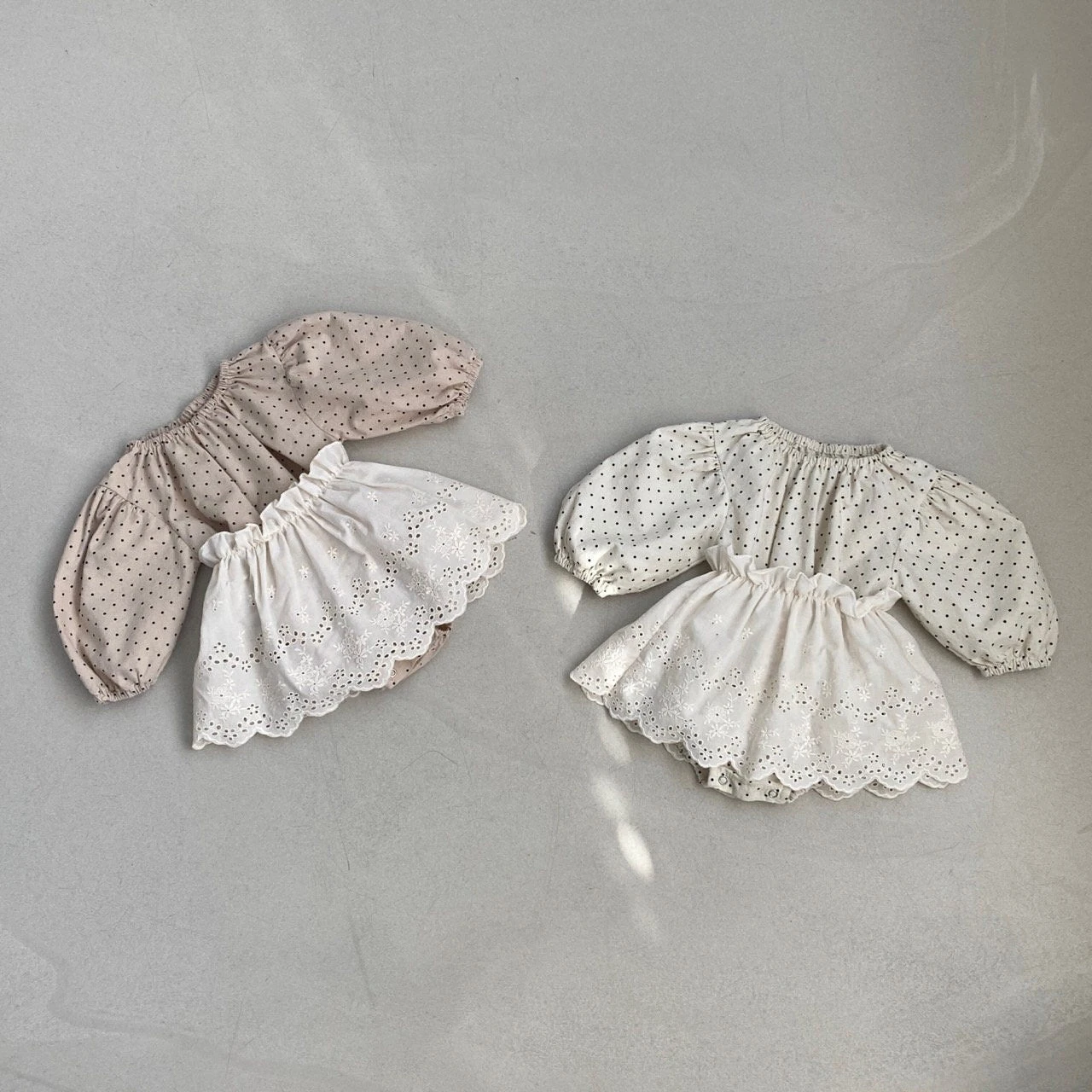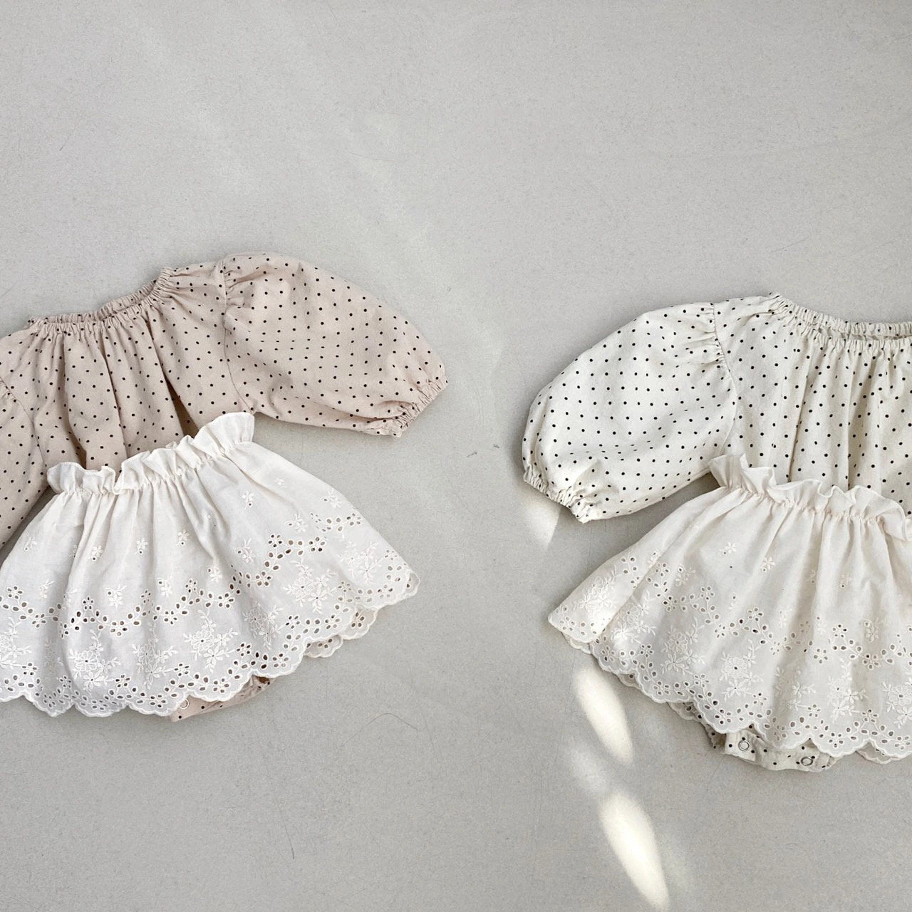 A darling polka dotted romper featuring a matching removable eyelet skirt.
