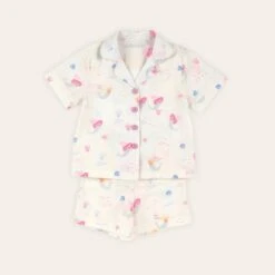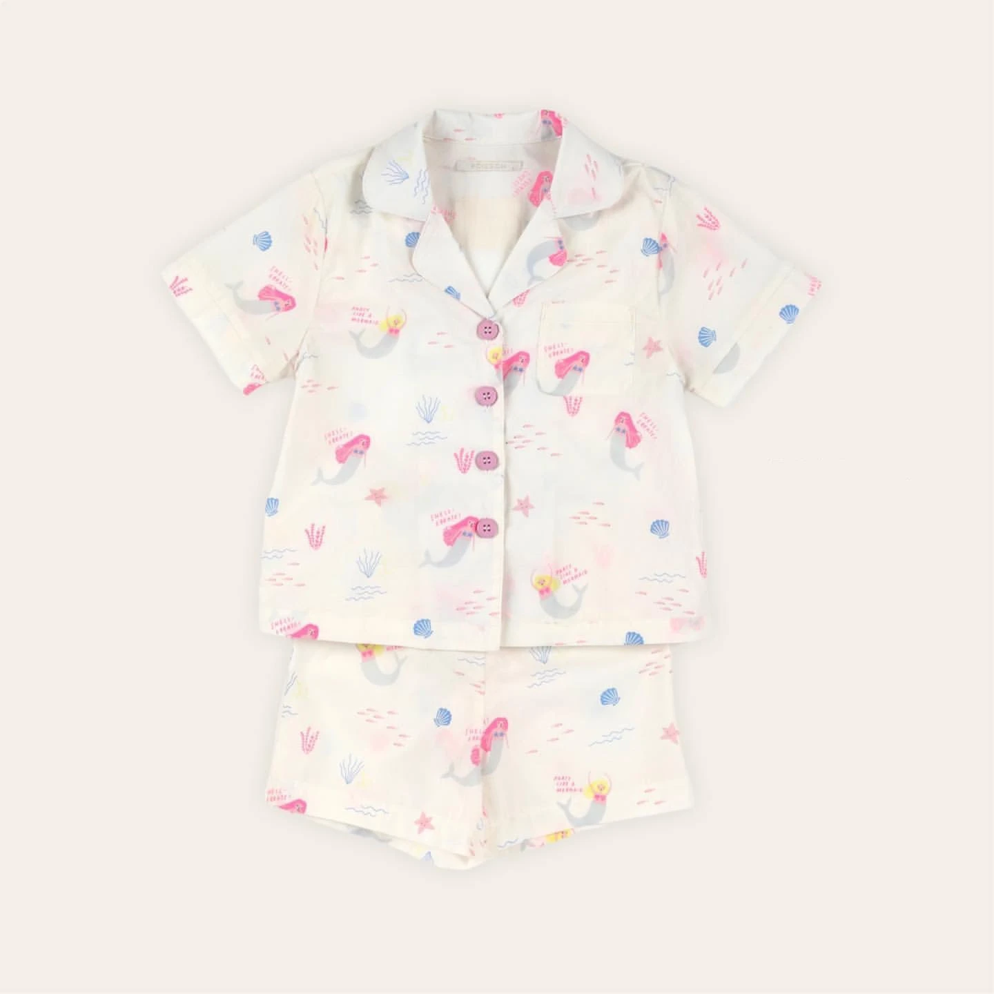 A short sleeved button up and matching shorties set featuring a fun, mermaid print.