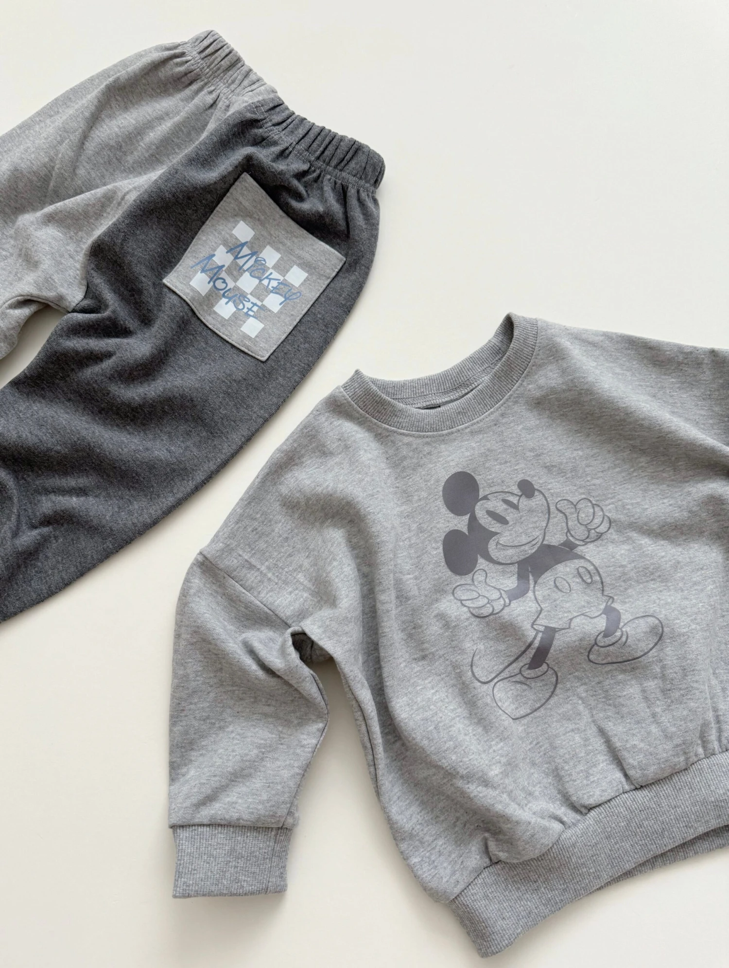A relaxed fit crewneck featuring a Mickey Mouse heat transfer print and matching color block joggers with details on the back pocket.