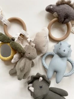 Mini dinosaur made in 100% organic cotton with recycled polyester filling.