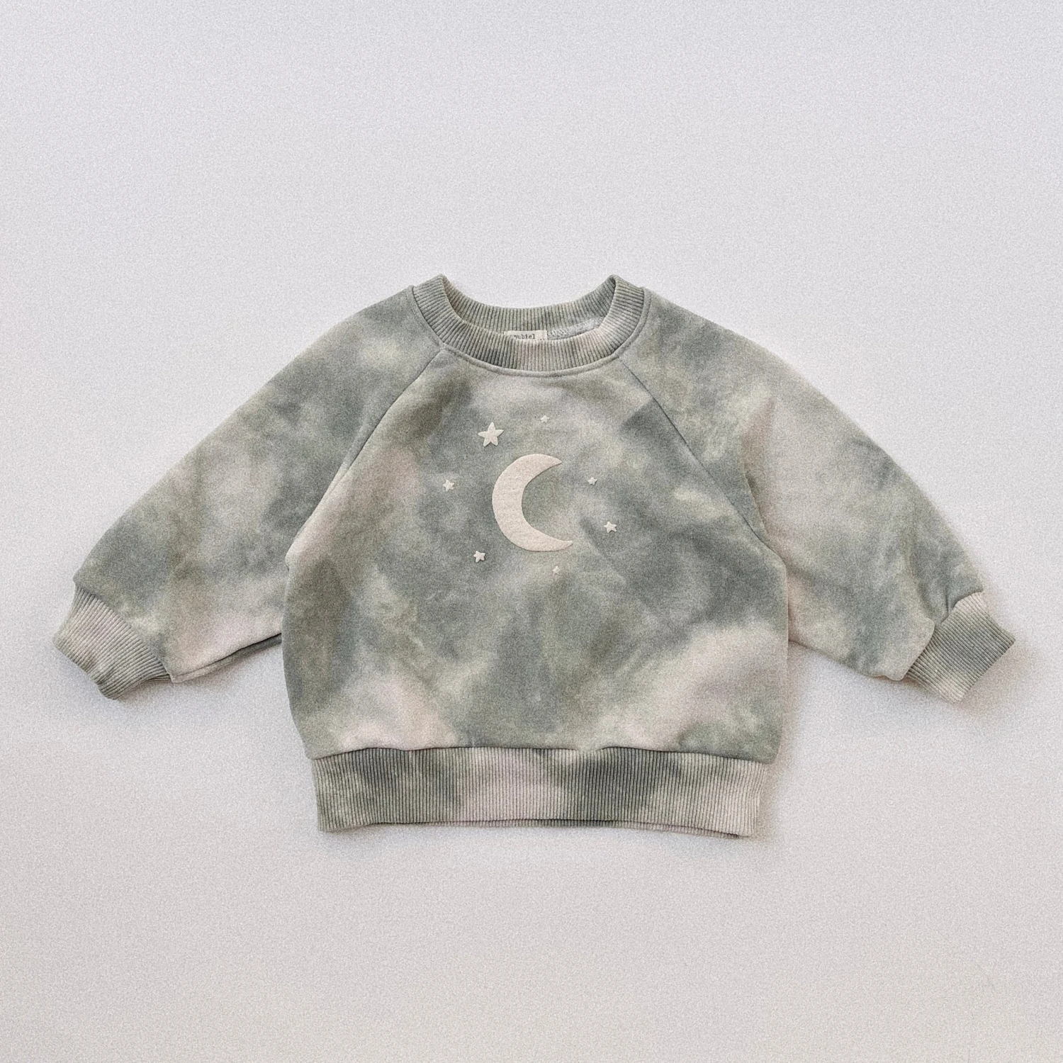 A tie dye crewneck sweatshirt featuring moon and little stars graphic printed across the front.