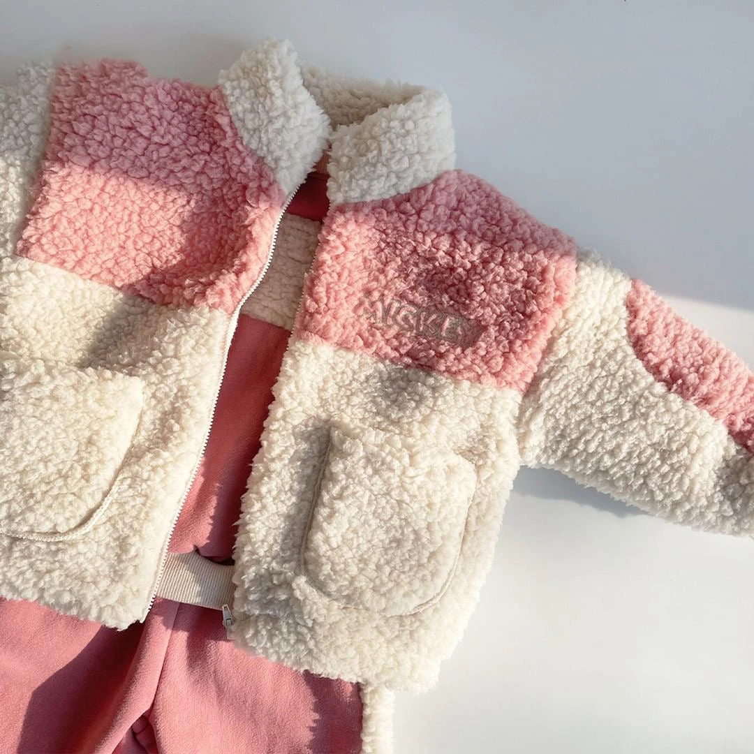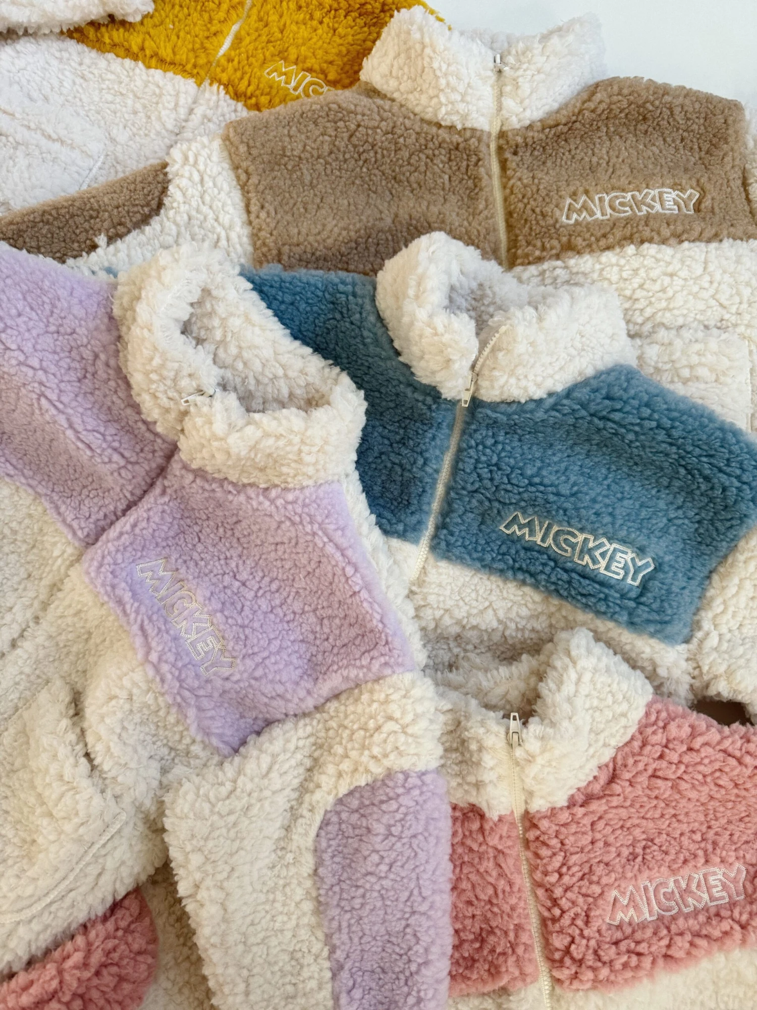 A perfectly oversized zip up Sherpa jacket featuring pockets and a a large Mickey patch in the backside.