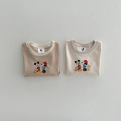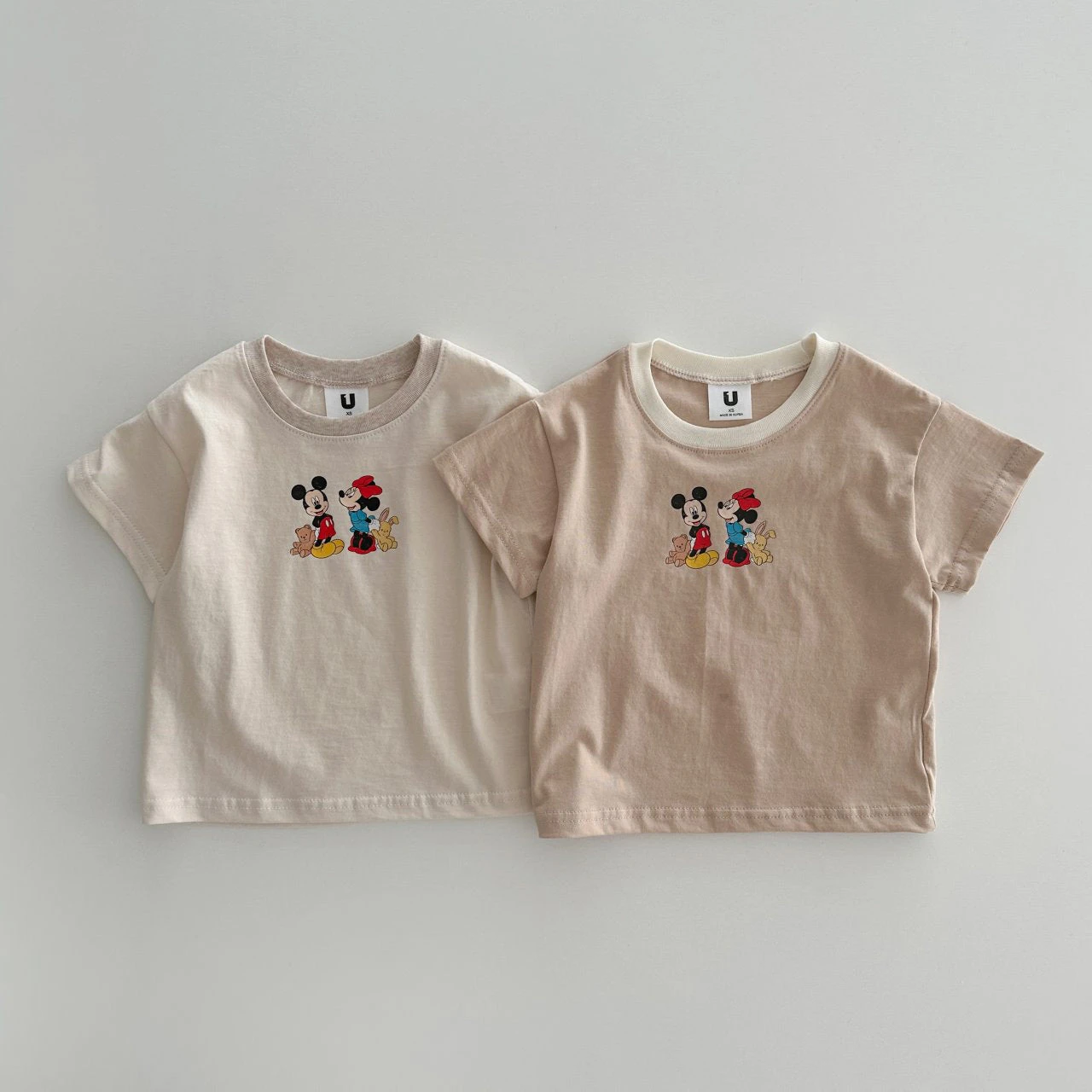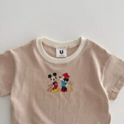 A short sleeved neutral tee featuring mickey + minnie mouse graphic on the front.Â