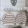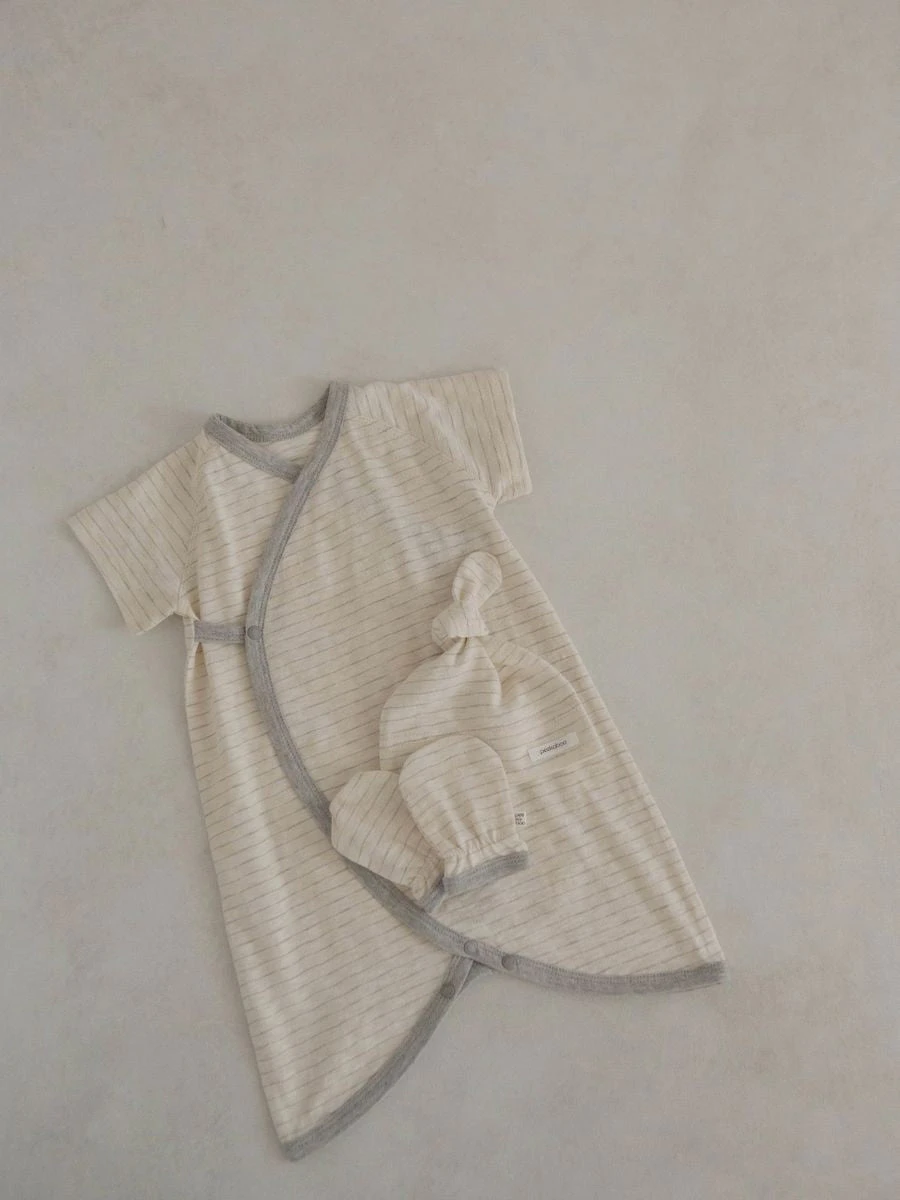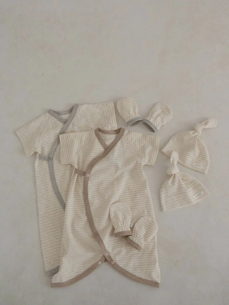 A striped newborn onesie set with a matching hat and gloves best recommended for 0-3 months.
