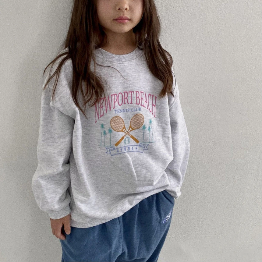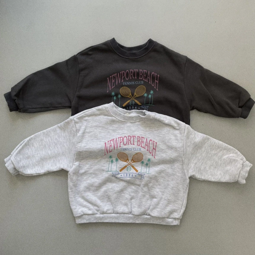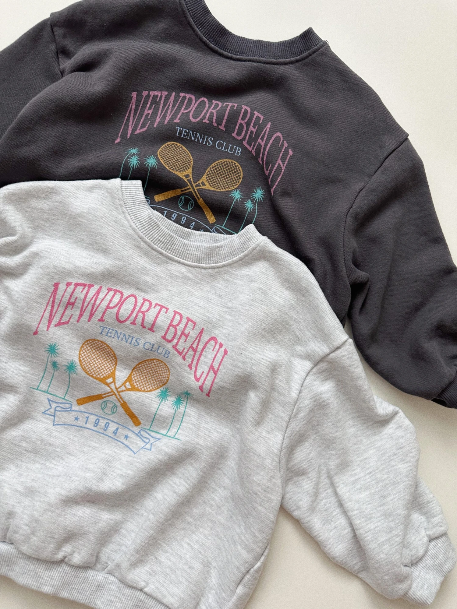 A perfectly oversized crewneck sweatshirt featuring “Newport Beach Tennis Club” graphic across the front.