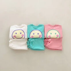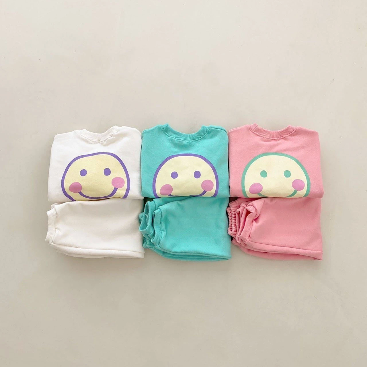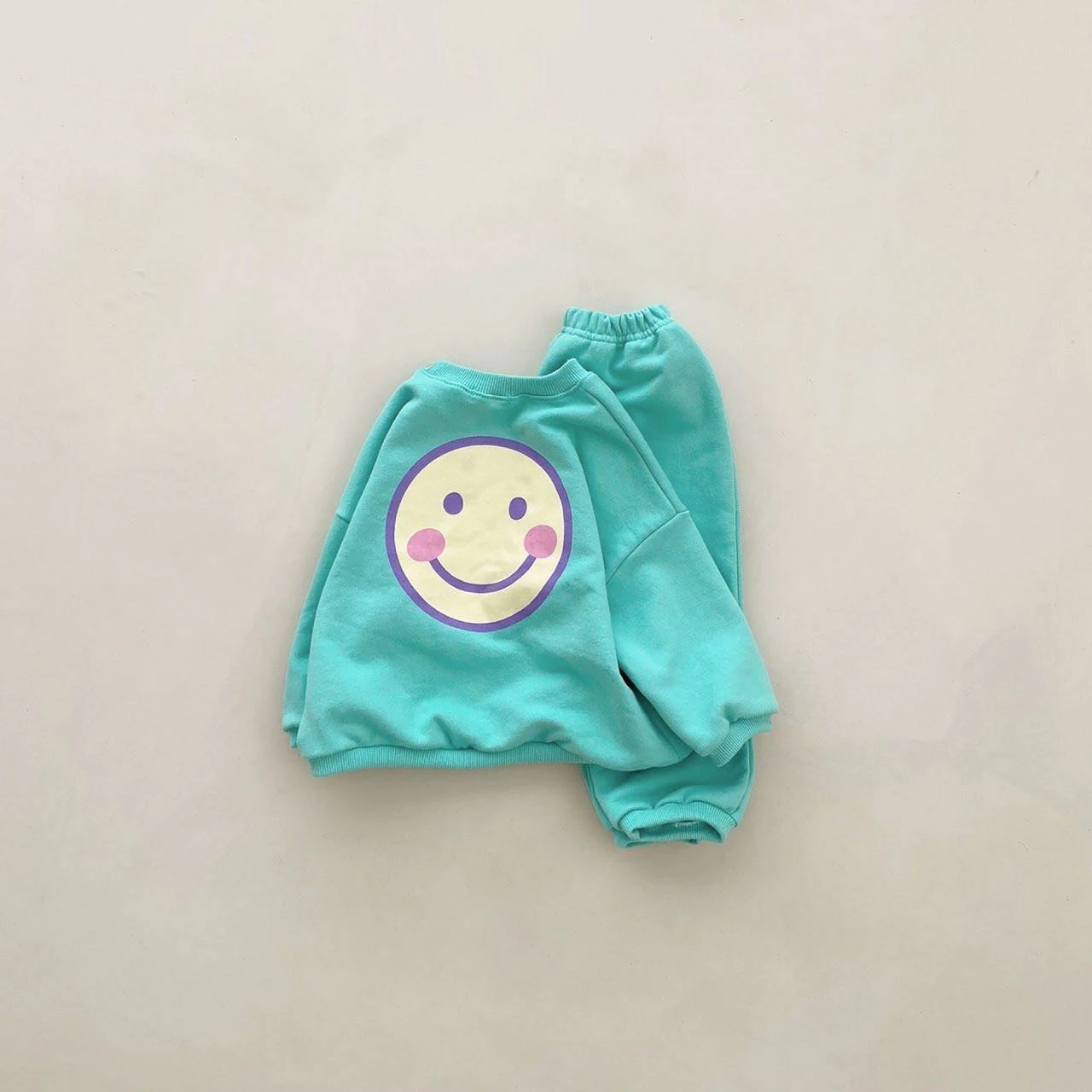 A fun oversized crewneck and joggers set featuring a happy face graphic on the back and “nice day” on the front.