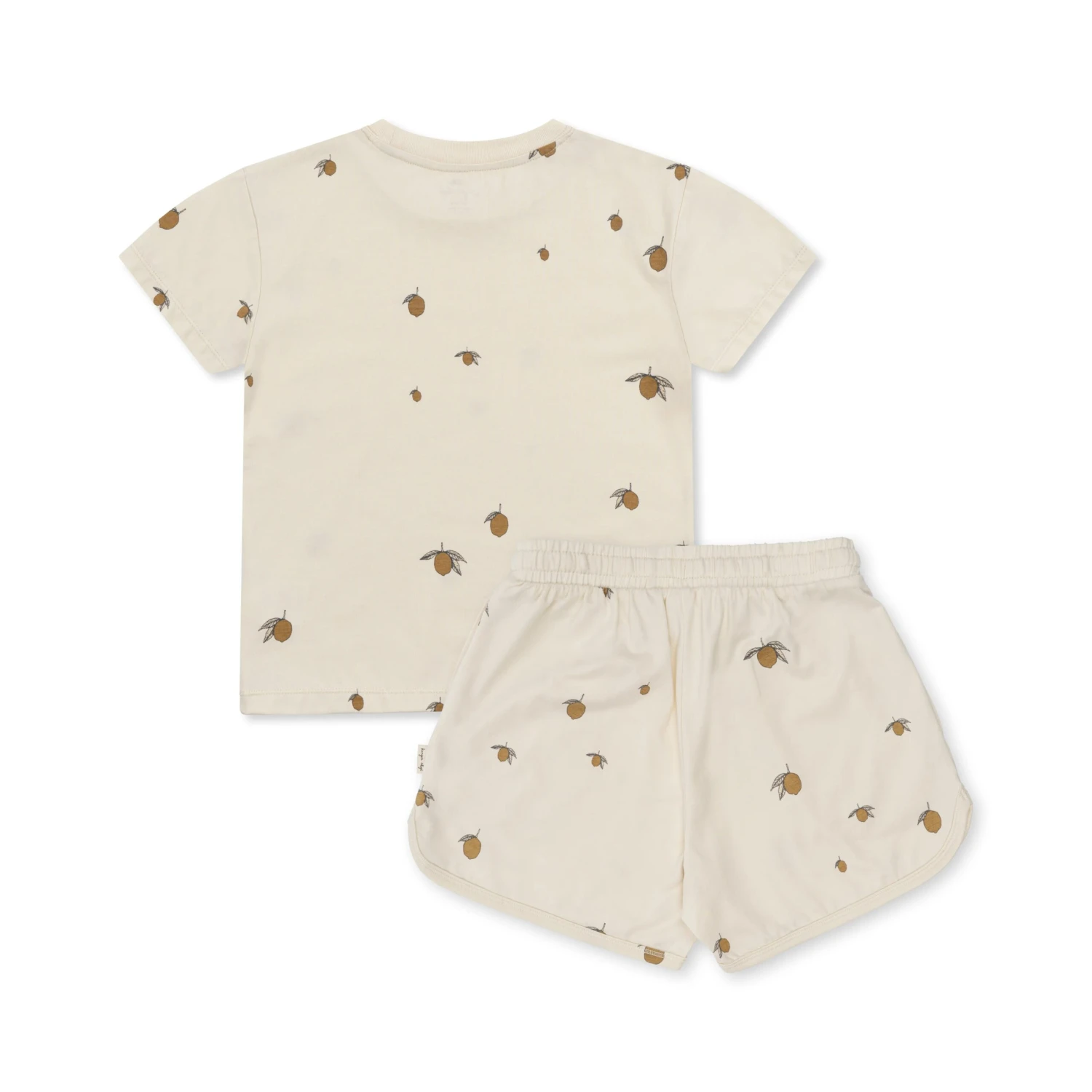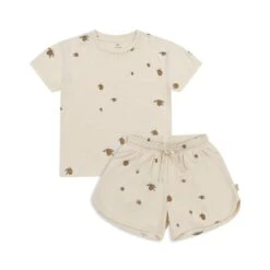 Set made in 95 percent organic cotton and 5 percent elastane. The tee is designed with a round neckline. The shorts feature a soft elasticated waist, side pockets and frills around the leg openings.