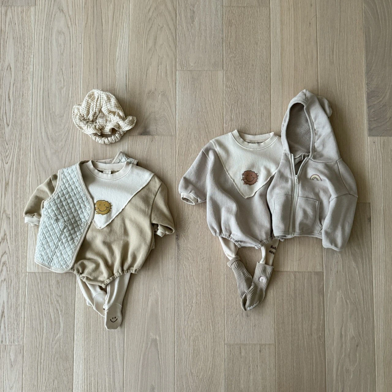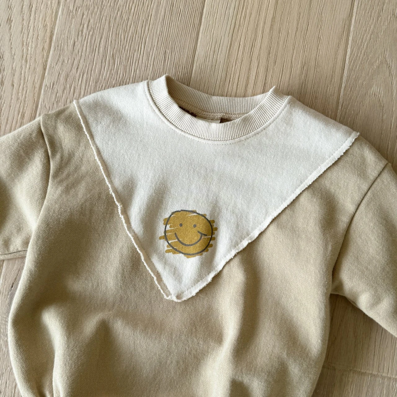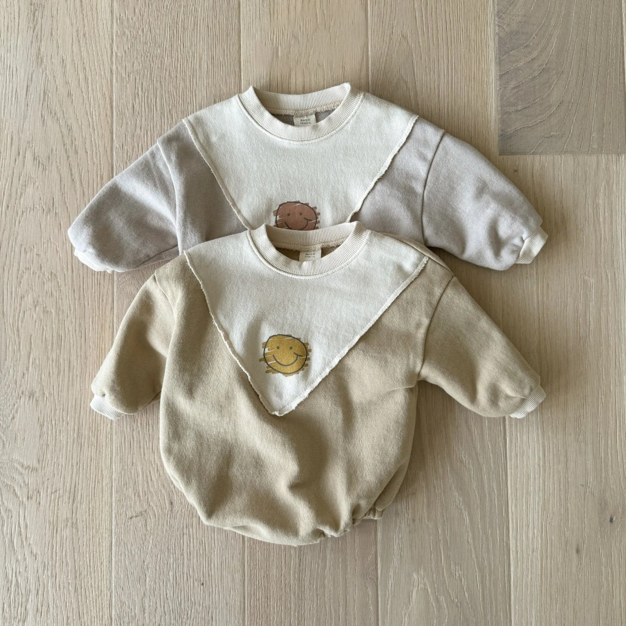 A cozy, perfectly oversized crew neck romper featuring a contrast color block detail and a smiley face on the frontz