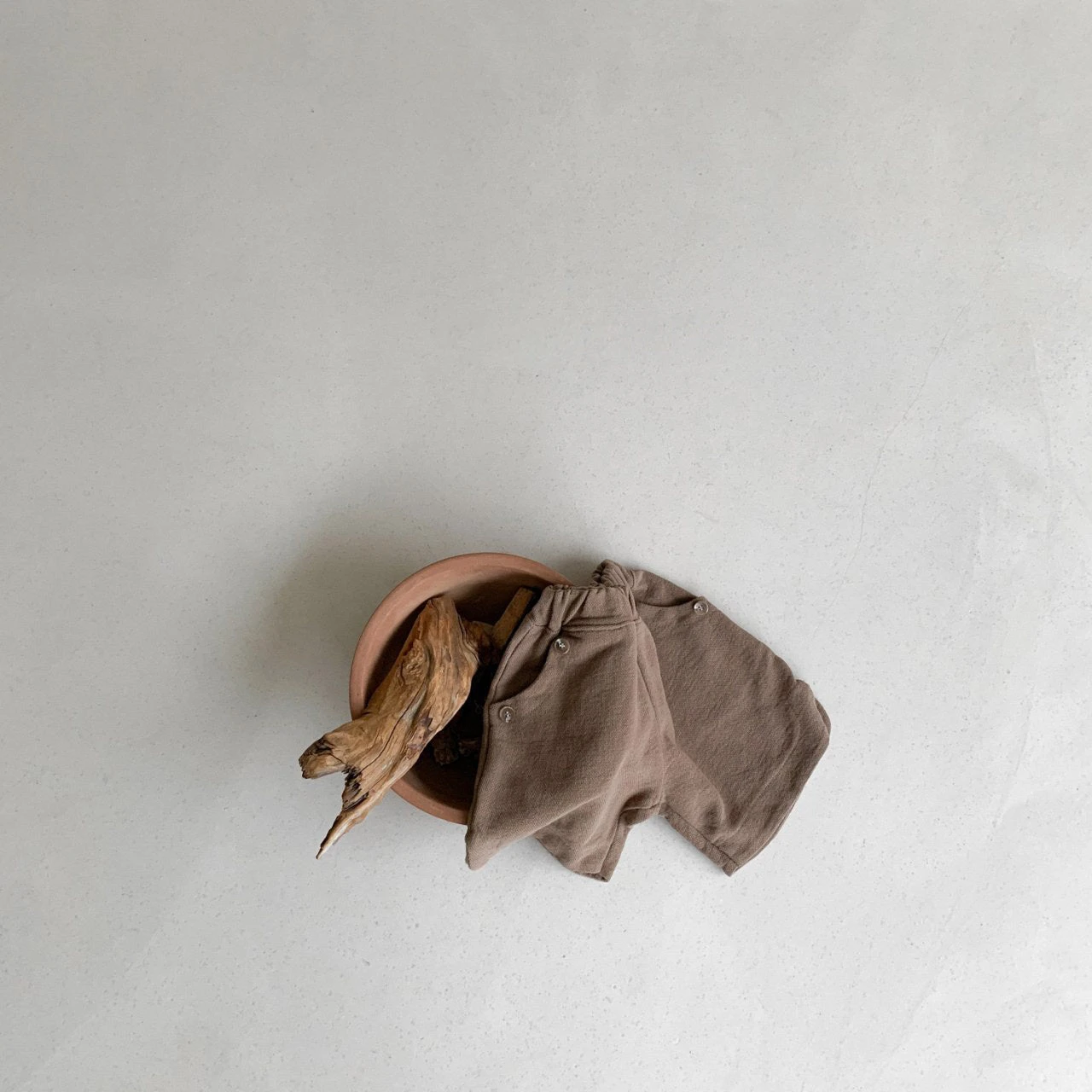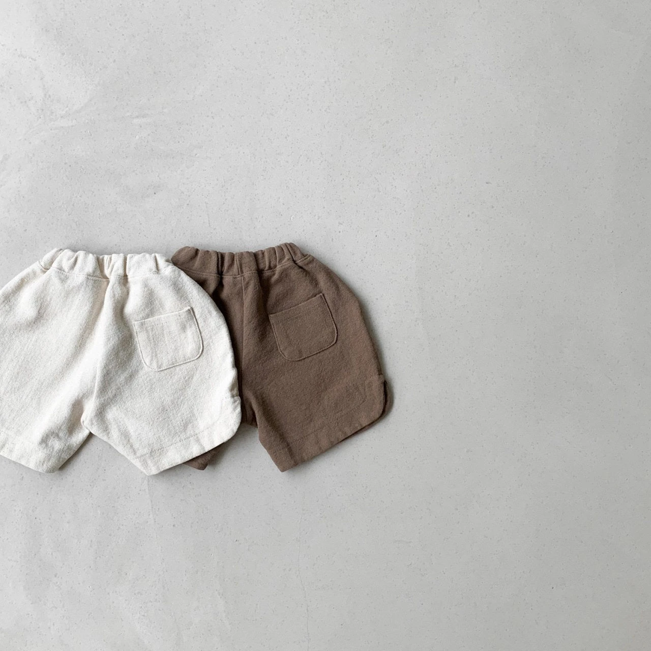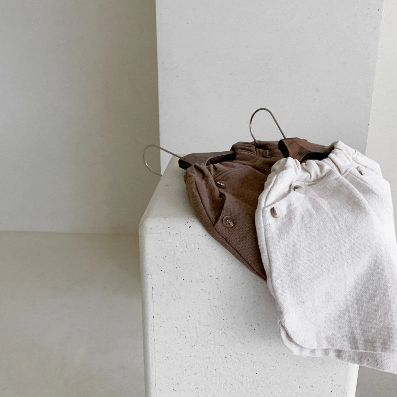 Shorts in a woven cotton blend, elastic waistband and button details at the pockets.