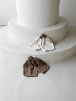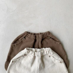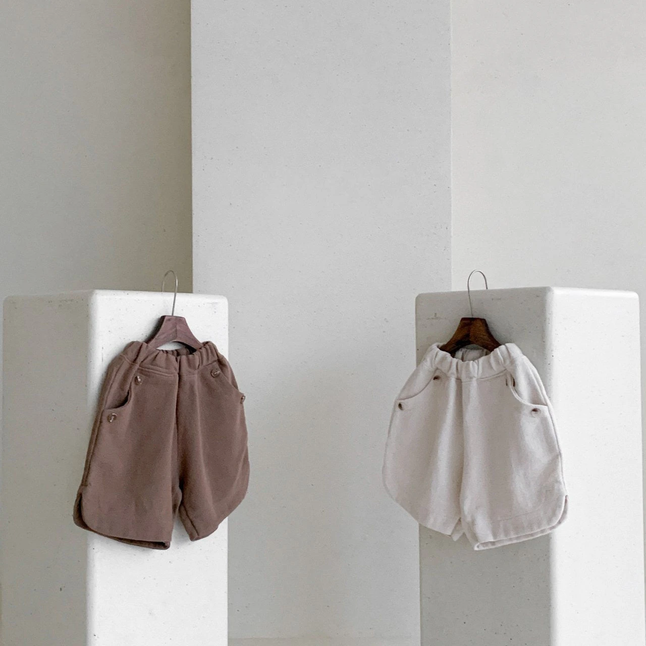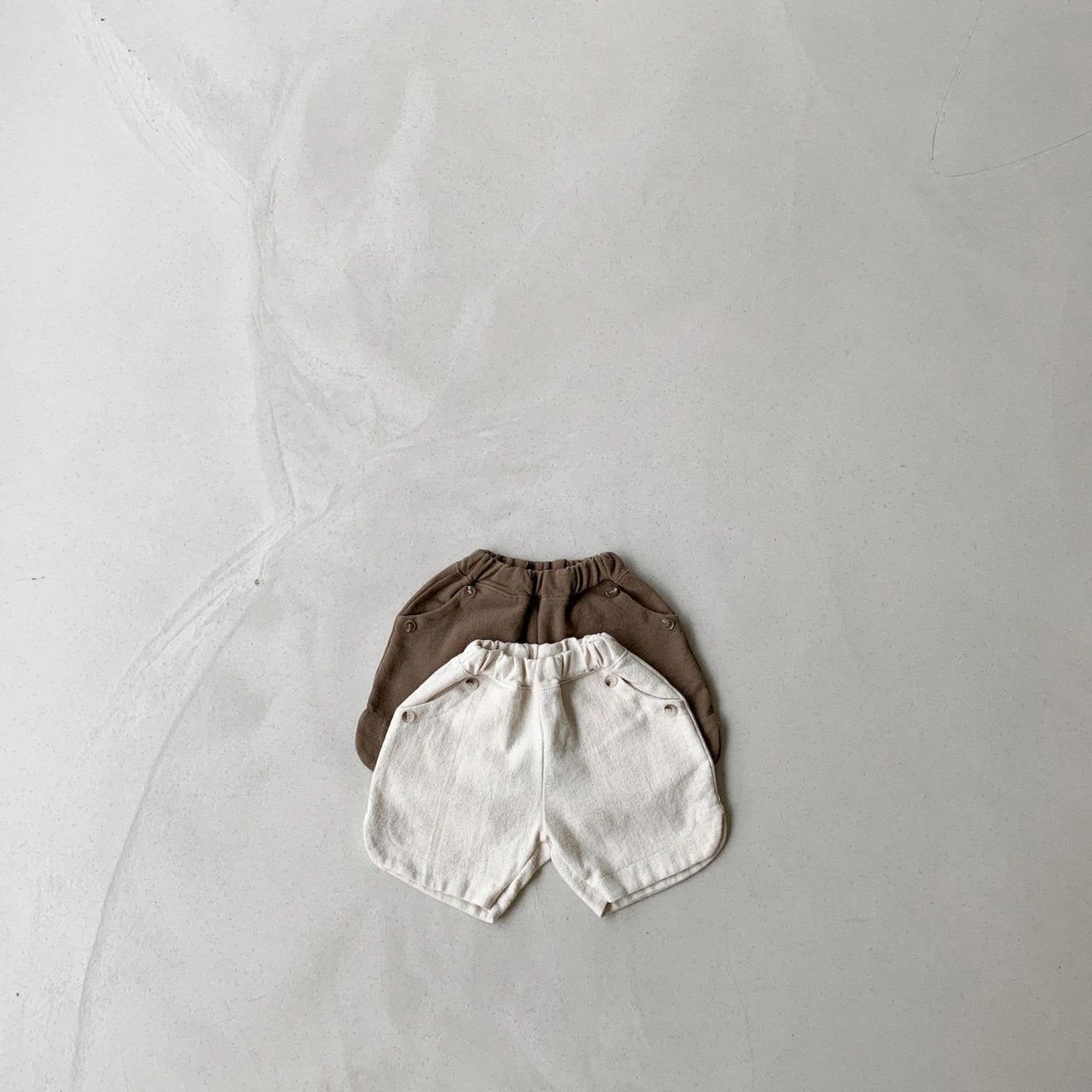 Shorts in a woven cotton blend, elastic waistband and button details at the pockets.